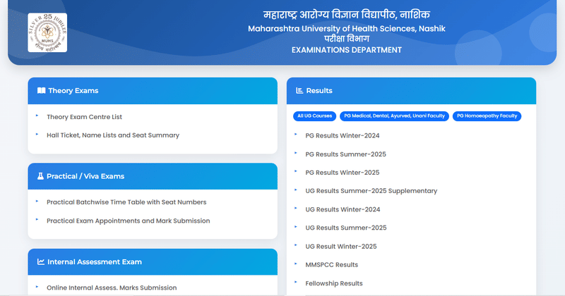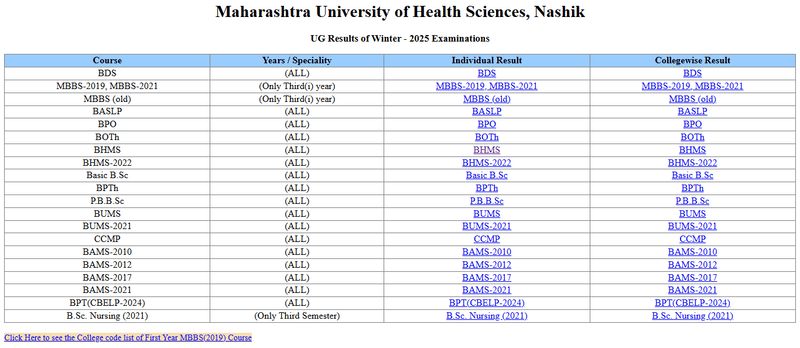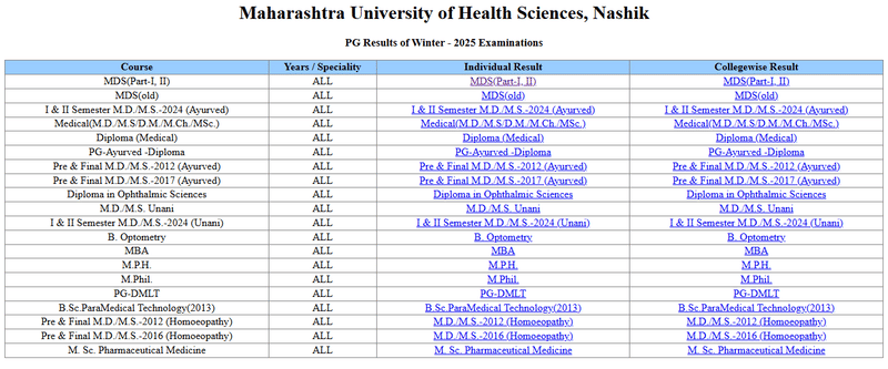 MUHS also releases college-wise semester results for its UG and PG programs. Around 400 colleges are affiliated with MUHS in various fields, including Medicine, Dentistry, Ayurveda & Unani, Homeopathy, Physiotherapy, Nursing, Paramedical Technology, and others.