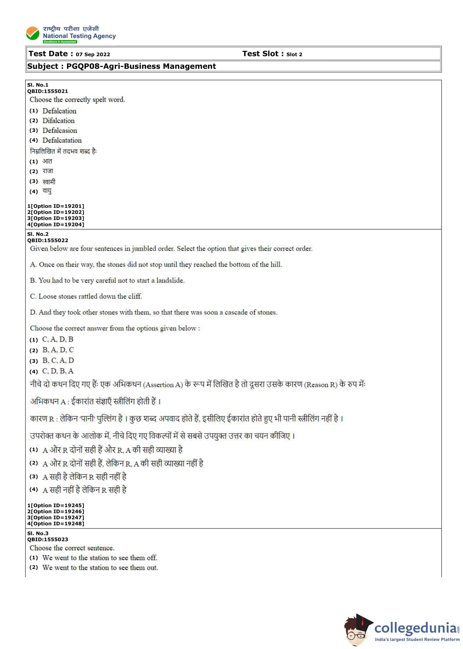 CUET PG Agri-Business Management Question Paper 2022 is available for download. CUET PG 2022 Agri-Business Management paper was conducted by National Testing Agency (NTA) on September 7, 2022 in Shift 2. The question paper comprised a total of 100 questions.