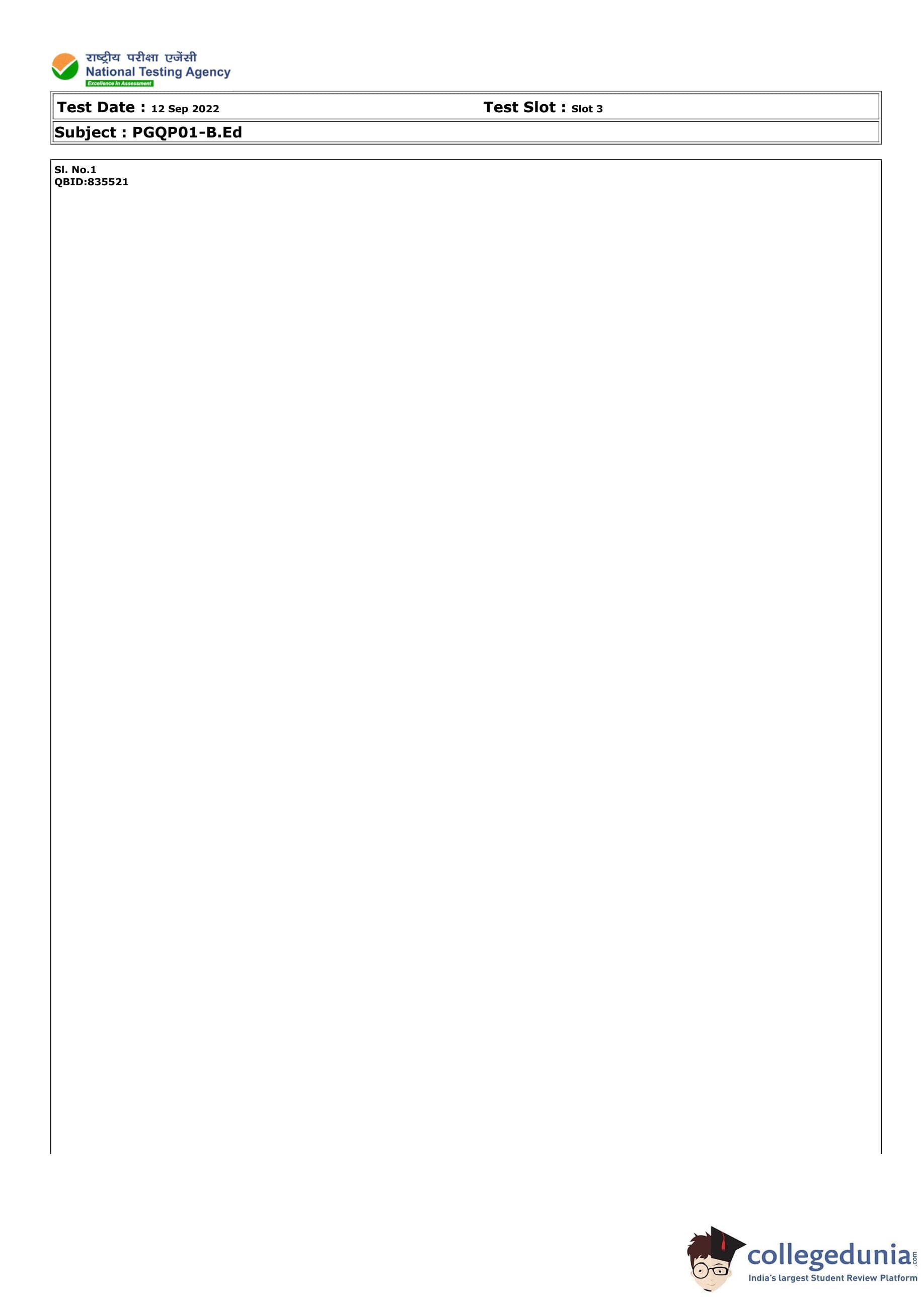 CUET PG B.Ed Question Paper 2022 is available for download. CUET PG 2022 B.Ed paper was conducted by National Testing Agency (NTA) on September 12, 2022 in Shift 3. The question paper comprised a total of 100 questions.
