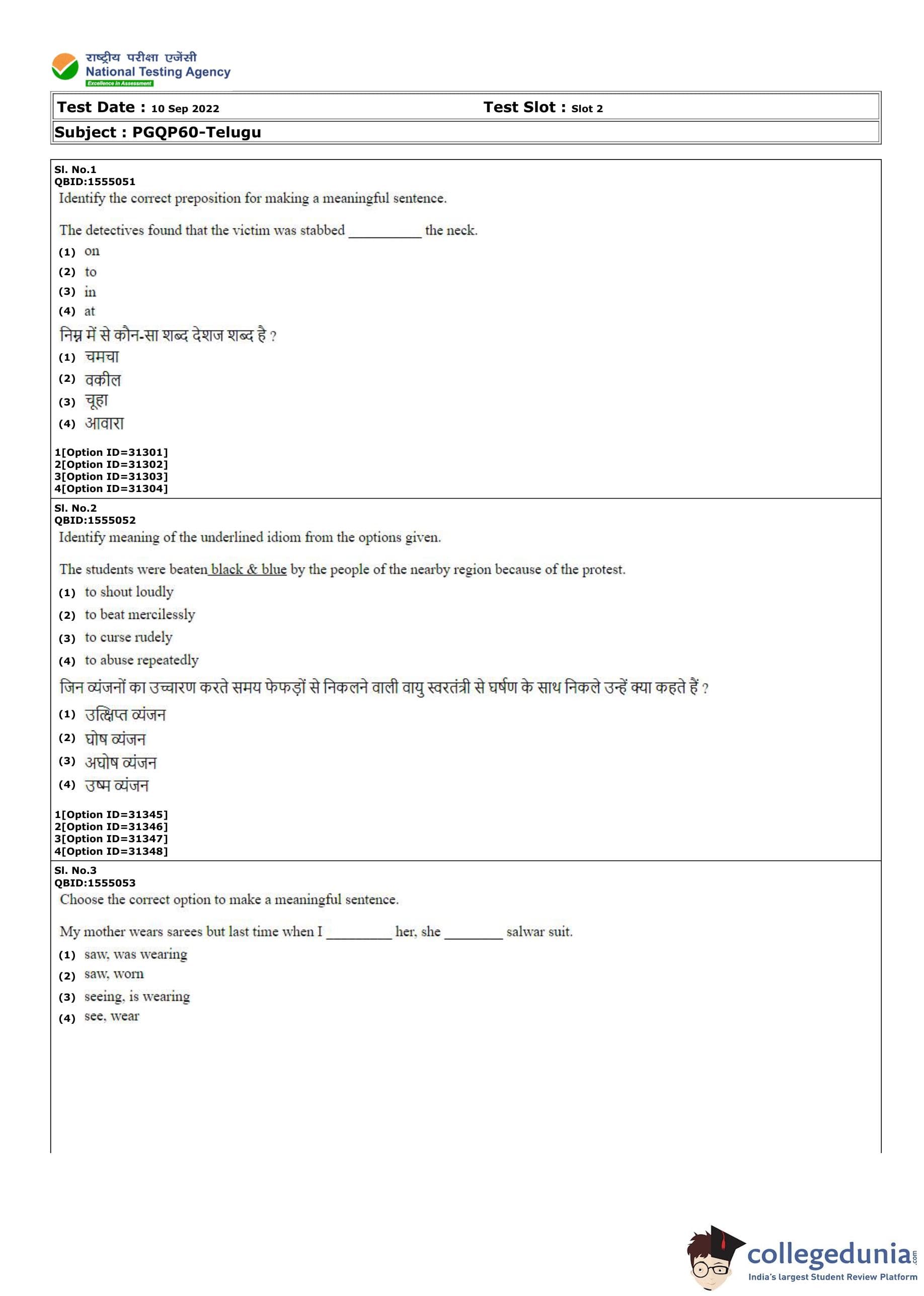 CUET PG Telugu Question Paper 2022 is available for download. CUET PG 2022 Telugu paper was conducted by National Testing Agency (NTA) on September 10, 2022 in Shift 2. The question paper comprised a total of 100 questions.