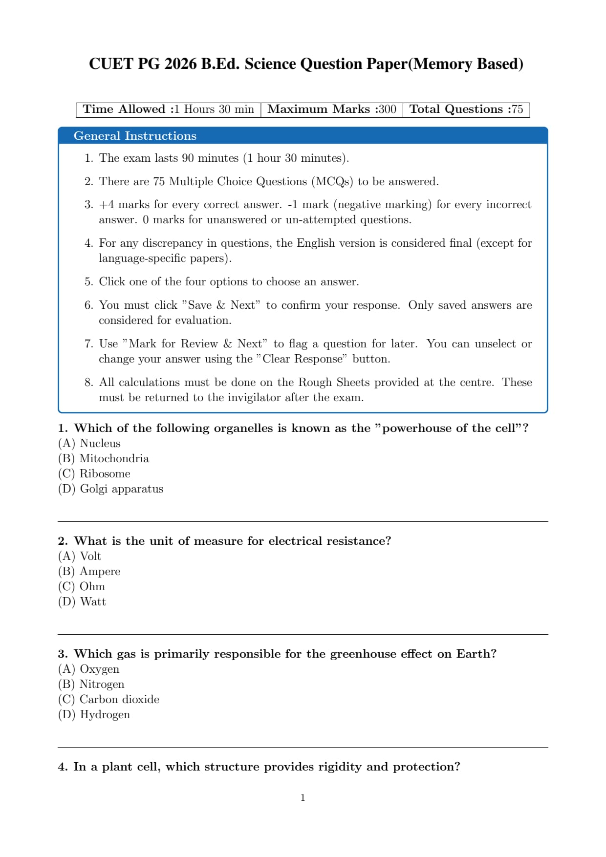 Students who appeared for the exam reported that the overall difficulty level of the paper was moderate. CUET PG 2026 B.Ed. Science Question Paper with Solutions PDF is available here for download. The marking scheme is +4 for correct answers and -1 for wrong answers, totaling 300 marks.