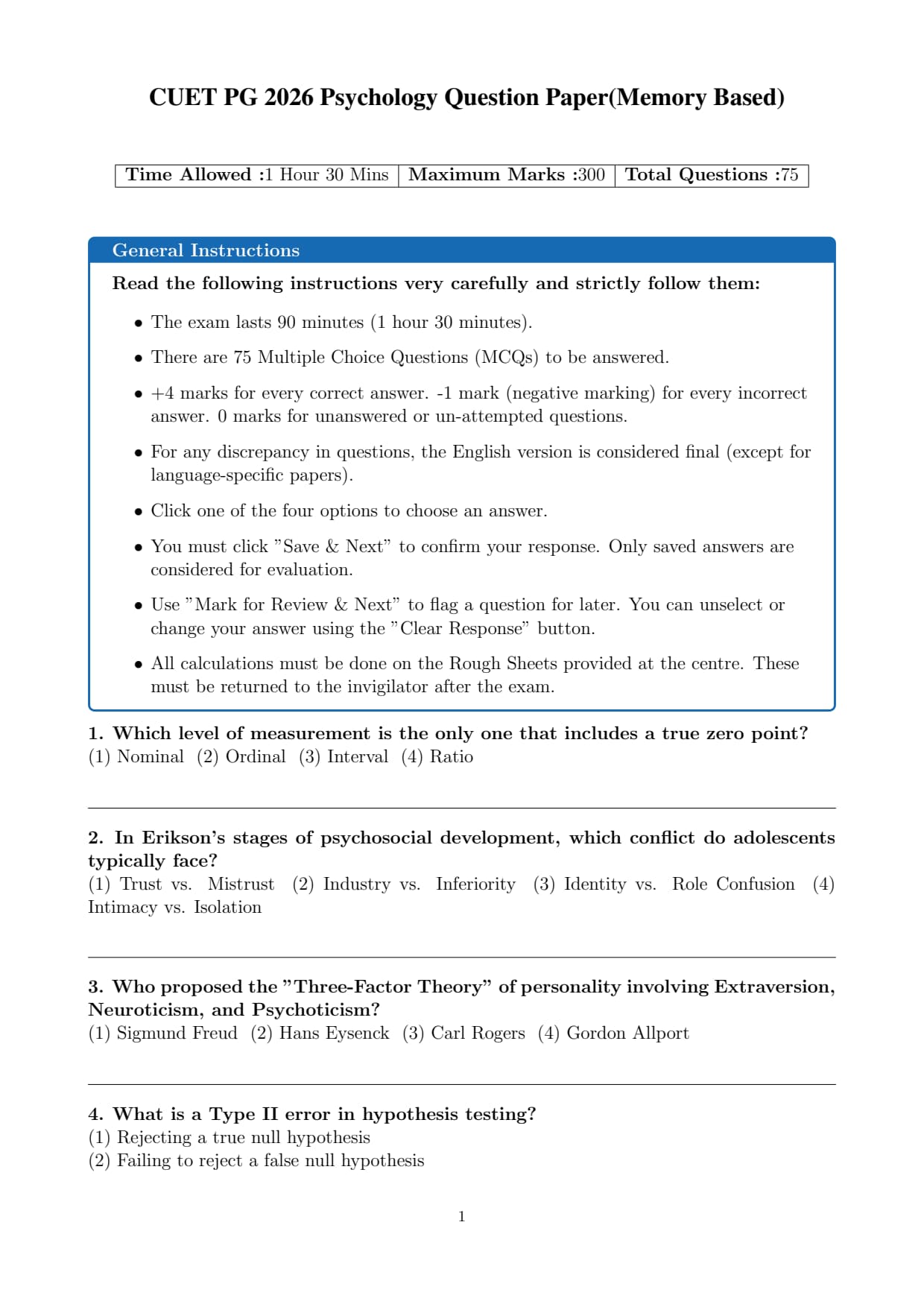 Students who appeared for the exam reported that the overall difficulty level of the paper was moderate. CUET PG 2026 Psychology Question Paper with Solutions PDF is available here for download. The marking scheme is +4 for correct answers and -1 for wrong answers, totaling 300 marks.