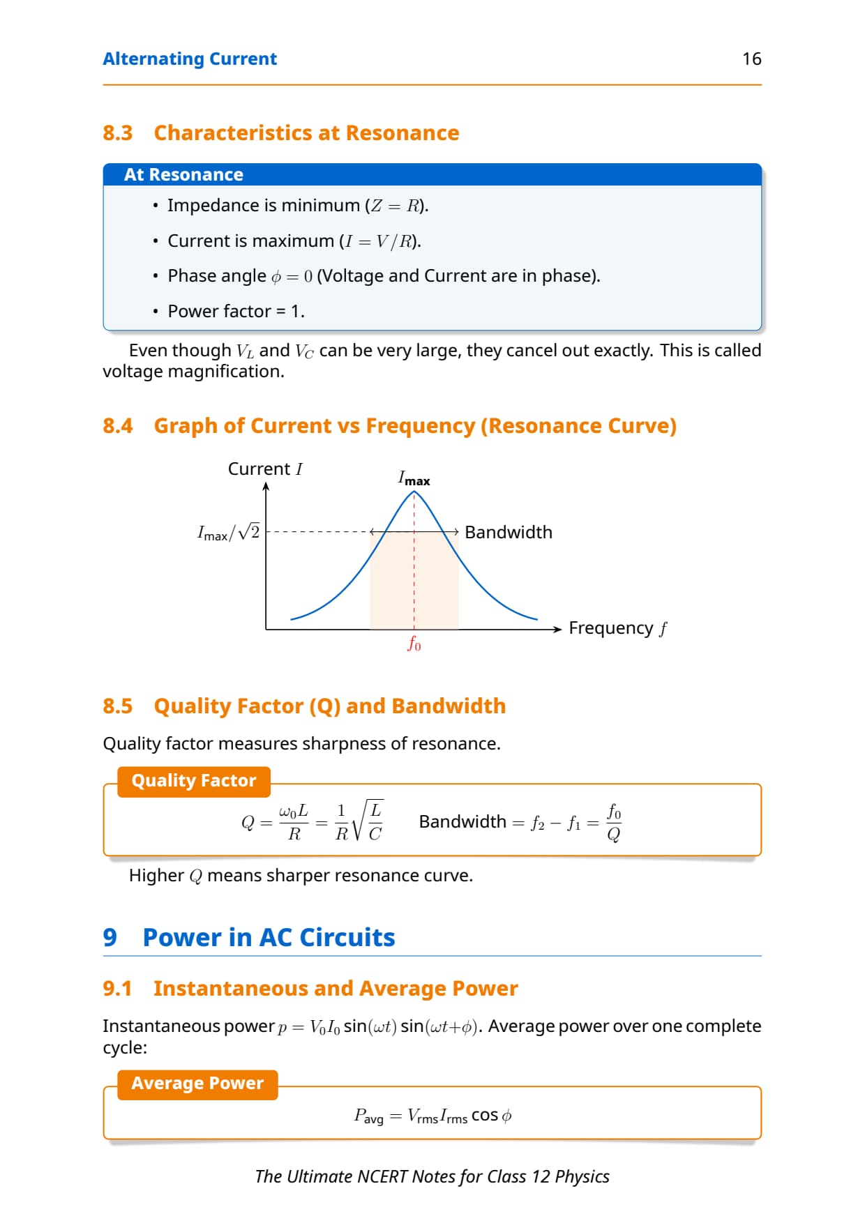 Quality Factor Learn the formula only Use in resonance sharpness questions Direct formula-based