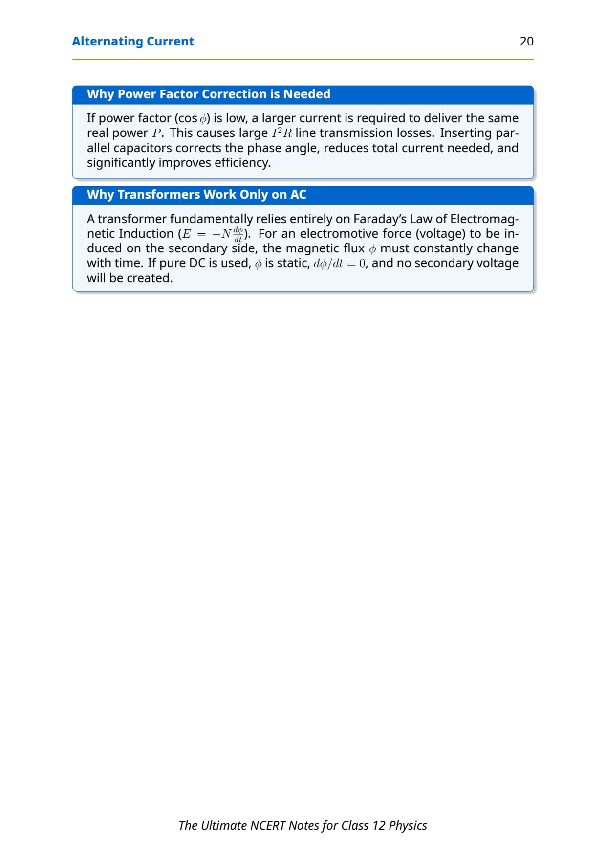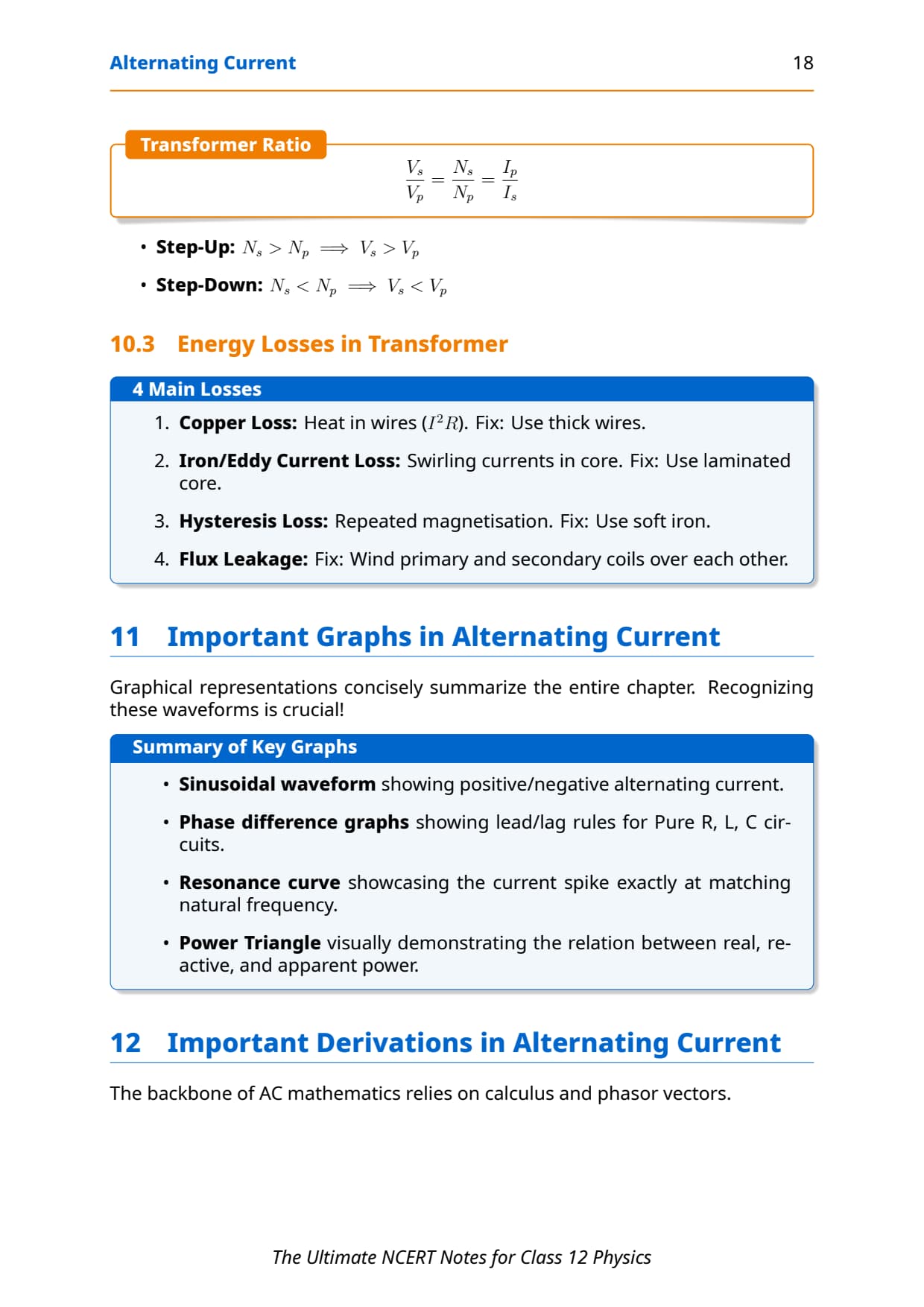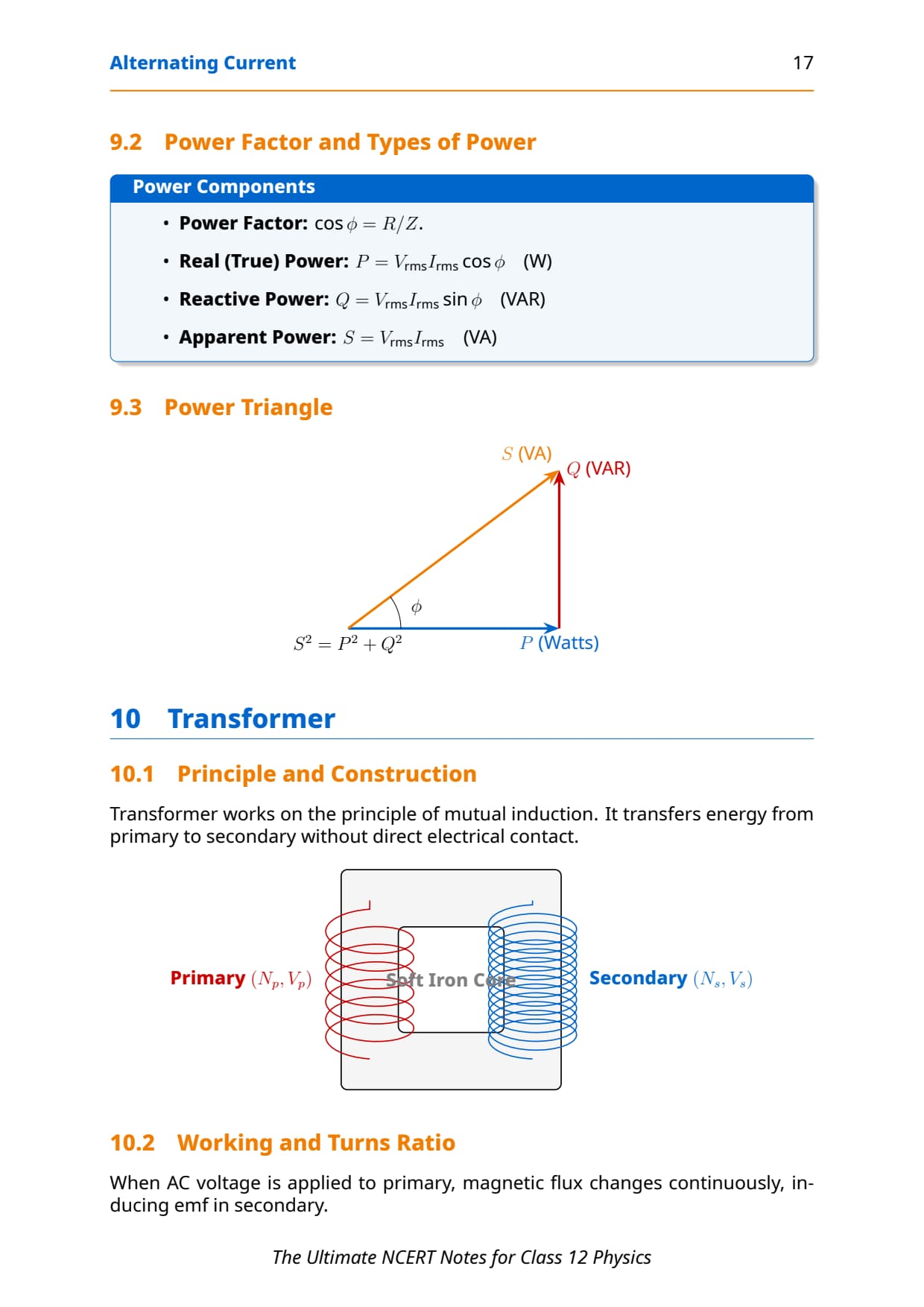 Power & Power Factor Learn derivation + meaning Mixed questions with RMS + phase Moderate weightage