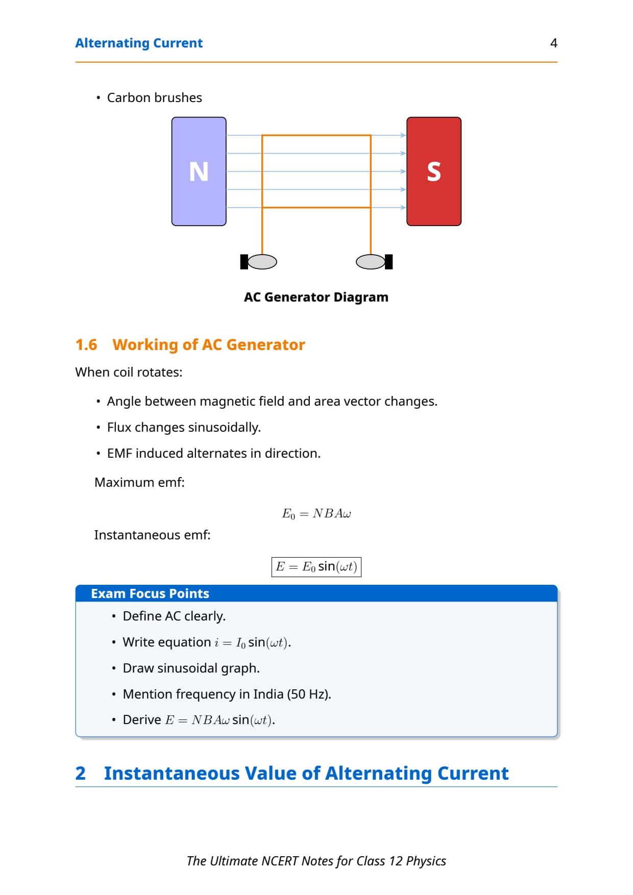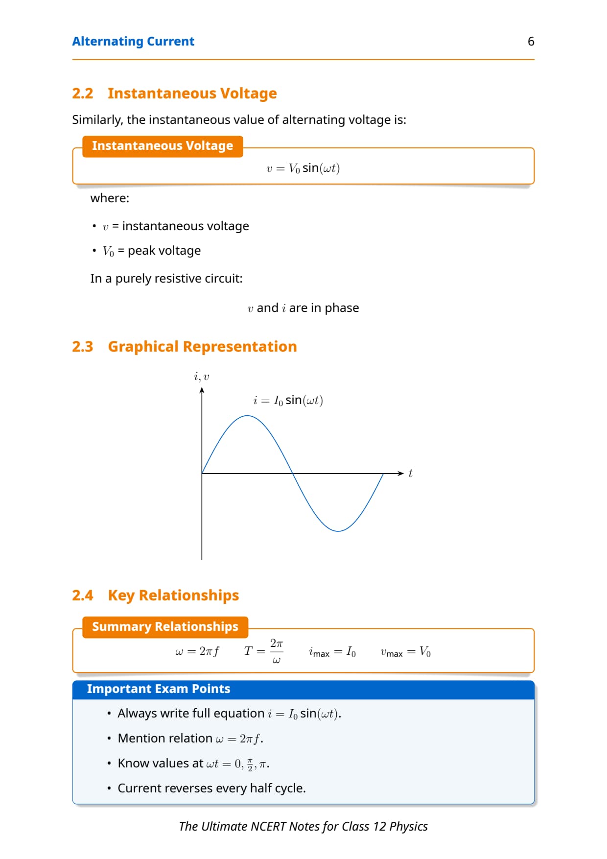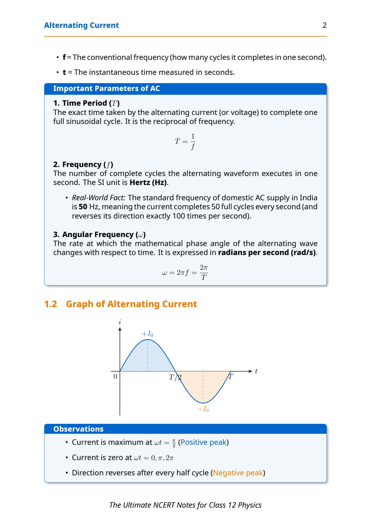 AC Basics Learn definition + waveform diagram Use equation in phase-based MCQs Easy 1 mark (CBSE), rarely direct in JEE