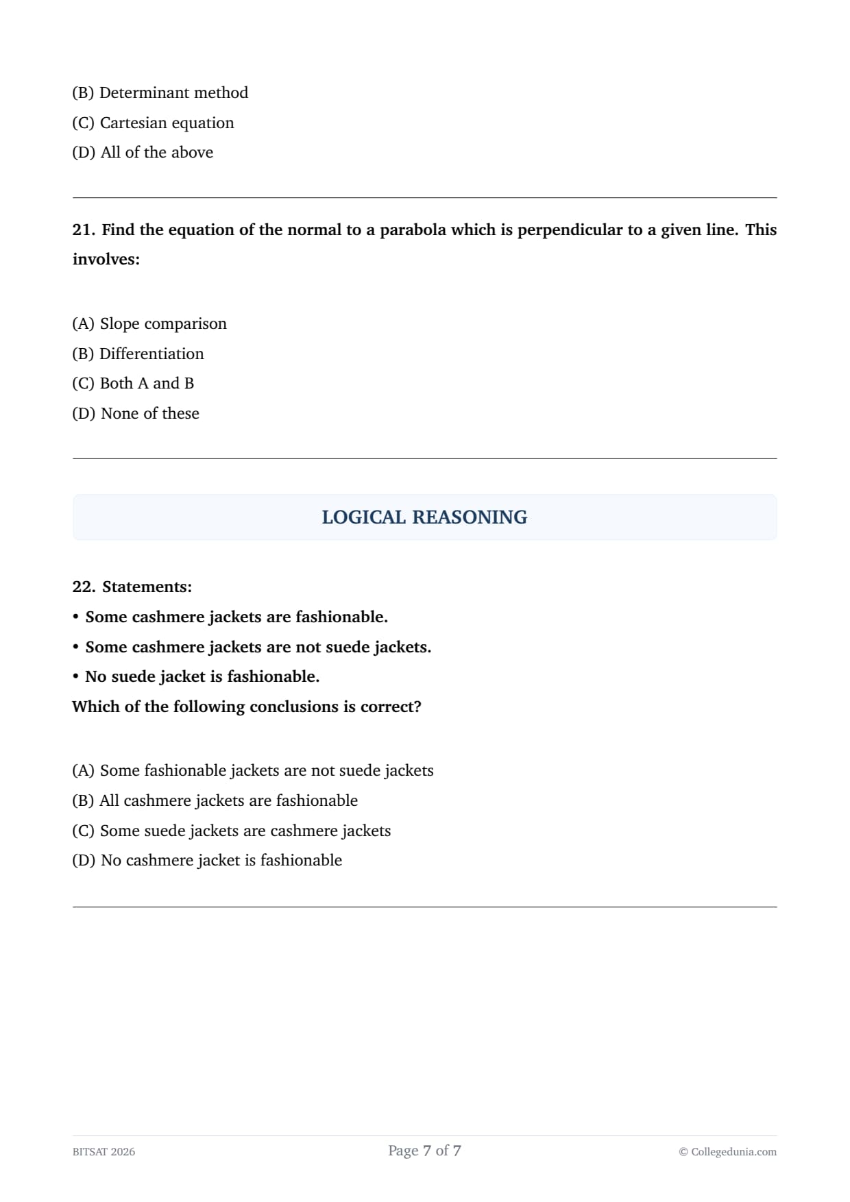 1. Conclusion (A): Since "No suede jacket is fashionable," it logically follows that any jacket that \textit{is fashionable cannot be a suede jacket. Therefore, all fashionable jackets are "not suede jackets." If all are not, then "some" are certainly not. This conclusion is universally true based on the third statement.