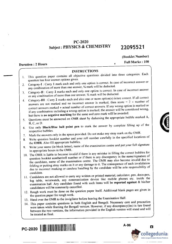 WBJEE 2020 Physics & Chemistry Question paper with answer key pdf conducted on Feb-02 in Afternoon Session is available for download. The exam was successfully organized by West Bengal Joint Entrance Examination Board (WBJEEB). In terms of difficulty level, WBJEE was of Moderate to tough level. The question paper comprised a total of 80 questions divided among Two sections.