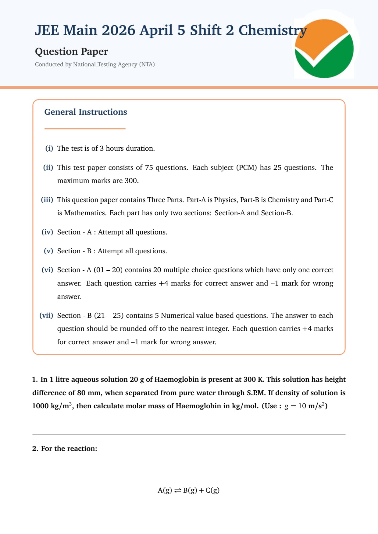 Candidates can download the JEE Main 2026 April 5 Shift 2 chemistry question paper along with detailed solutions to analyze their performance and understand the exam pattern better.