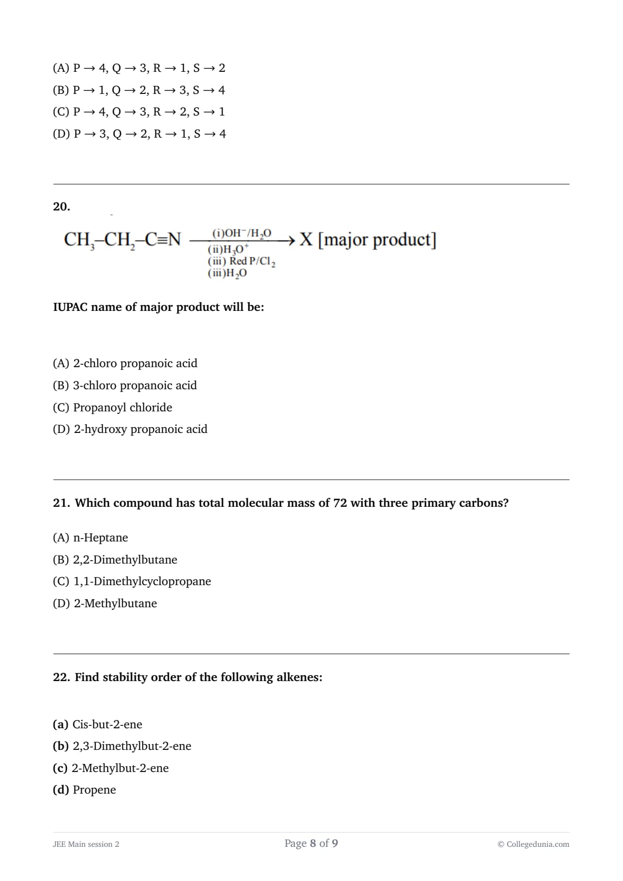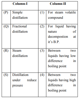 Final Answer: (A) P \( \rightarrow \) 4, Q \( \rightarrow \) 3, R \( \rightarrow \) 1, S \( \rightarrow \) 2. Quick Tip: In distillation methods: Simple distillation is for liquids with high boiling point differences, fractional distillation for small differences, steam distillation for heat-sensitive compounds, and reduced pressure distillation is for high boiling substances that decompose at boiling point.