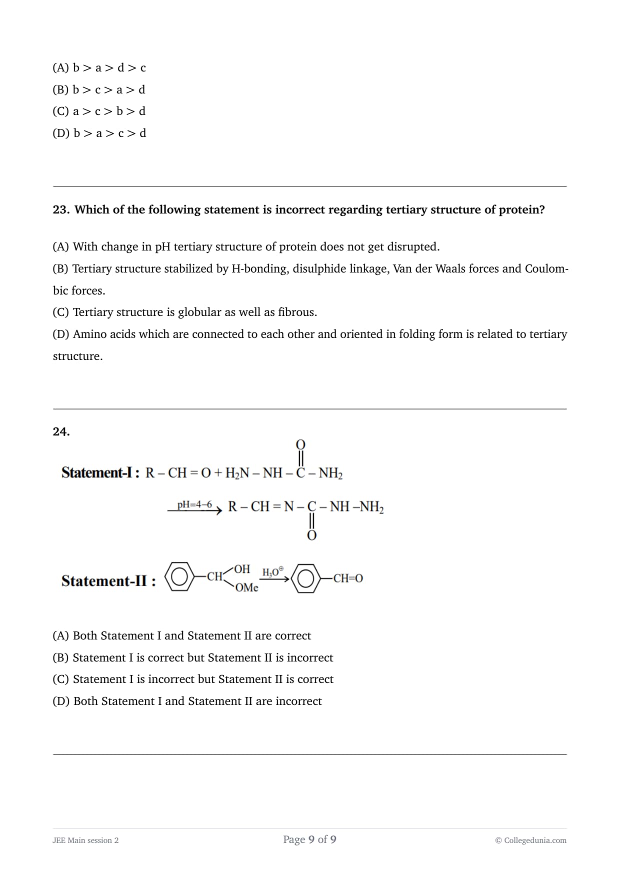 Final Answer: (A) With change in pH tertiary structure of protein does not get disrupted. Quick Tip: Changes in pH can lead to the disruption of the tertiary structure of proteins, often resulting in denaturation. Always consider the effects of environmental factors on protein structure.