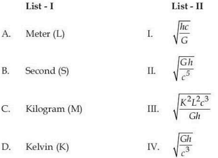 Match List - I with List - II (where h is Planck's constant, G is gravitational constant and c is speed of light):