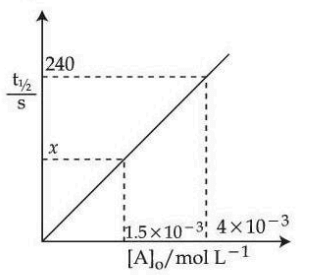For a reaction \(A \to P\) at \(T\) K, the half life (\(t_{1/2}\)) is plotted as a function of initial concentration \([A]_o\) of A as given below. The value of \(x\) in the given figure is ______ s (Nearest integer)