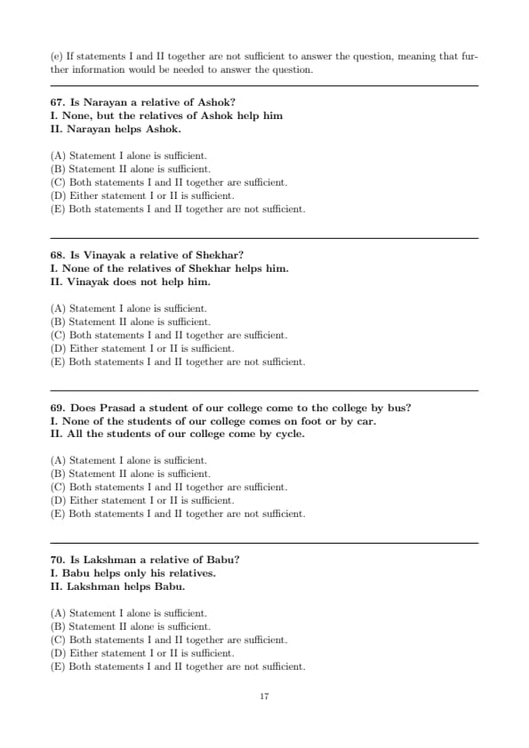 There is no connection between the two statements. Statement I's condition applies when Babu is the one giving help. Statement II describes a situation where Babu is receiving help. The information is unrelated and cannot be combined to reach a conclusion.