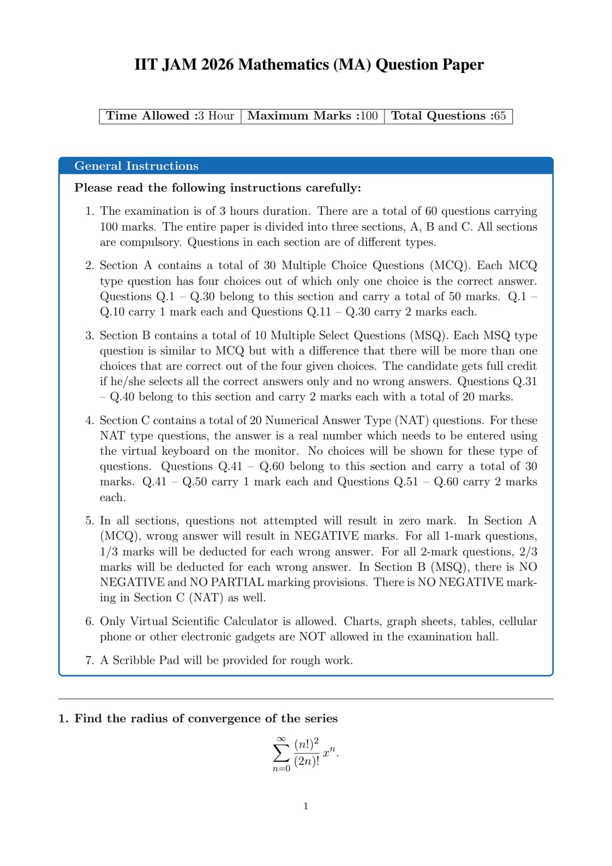 IIT JAM 2026 Mathematics (MA) Question Paper with Solution PDF – Memory Based