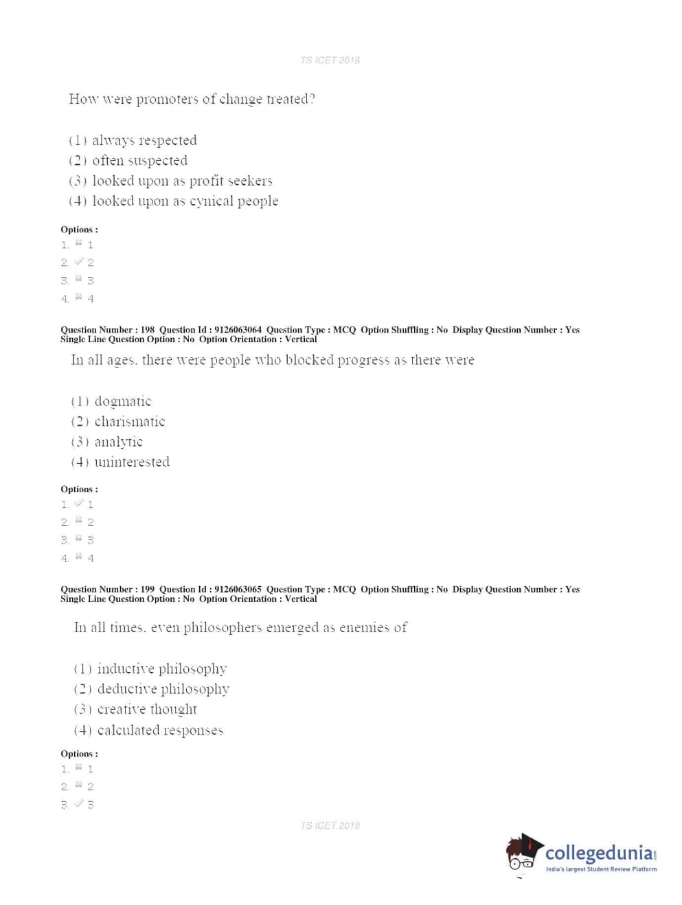 TSICET 2018 Question paper with answer key pdf conducted on May 23, 2018 in Shift 2 is available for download. The exam was successfully organized by Kakatiya University, Warangal. The question paper comprised a total of 200 questions.