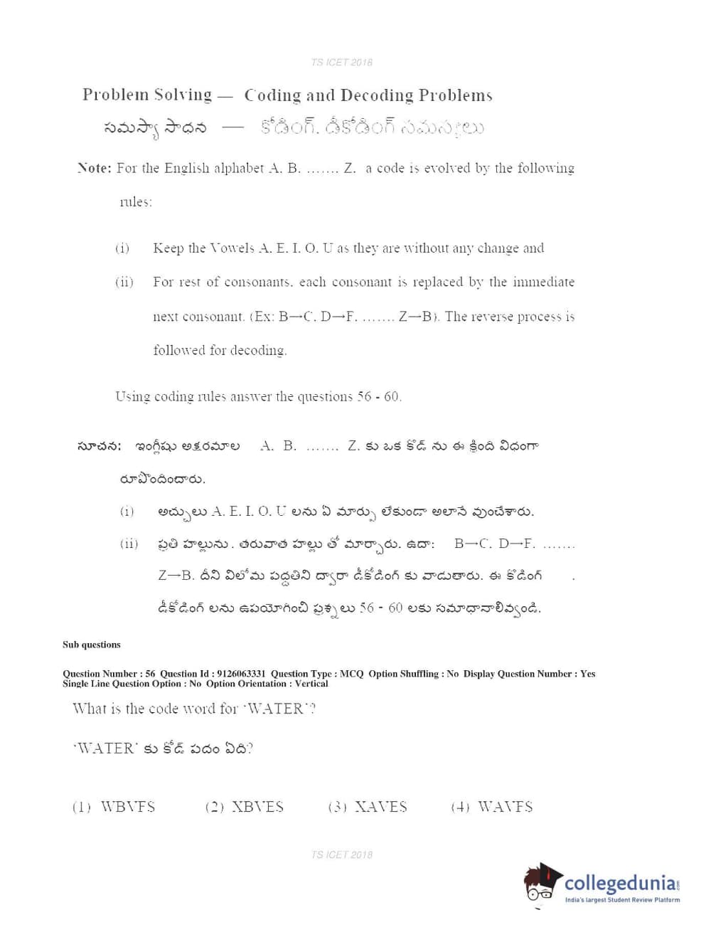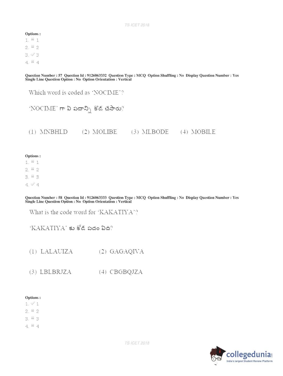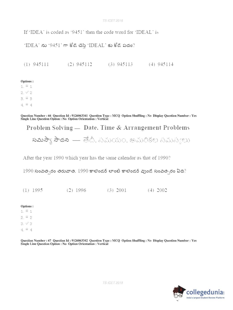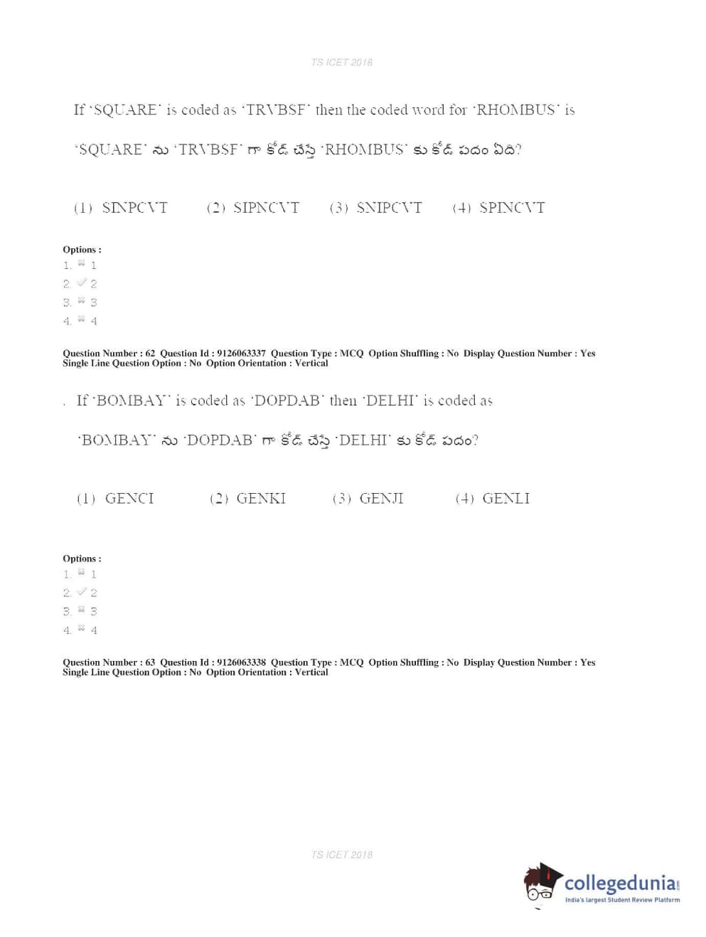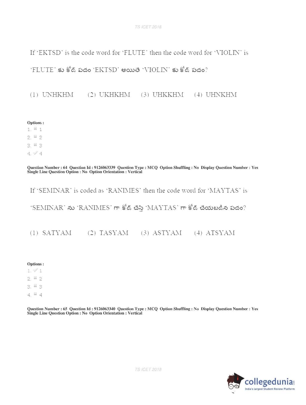 TSICET 2018 Question Paper with Answer Key PDFs in Telugu ,Shift 1