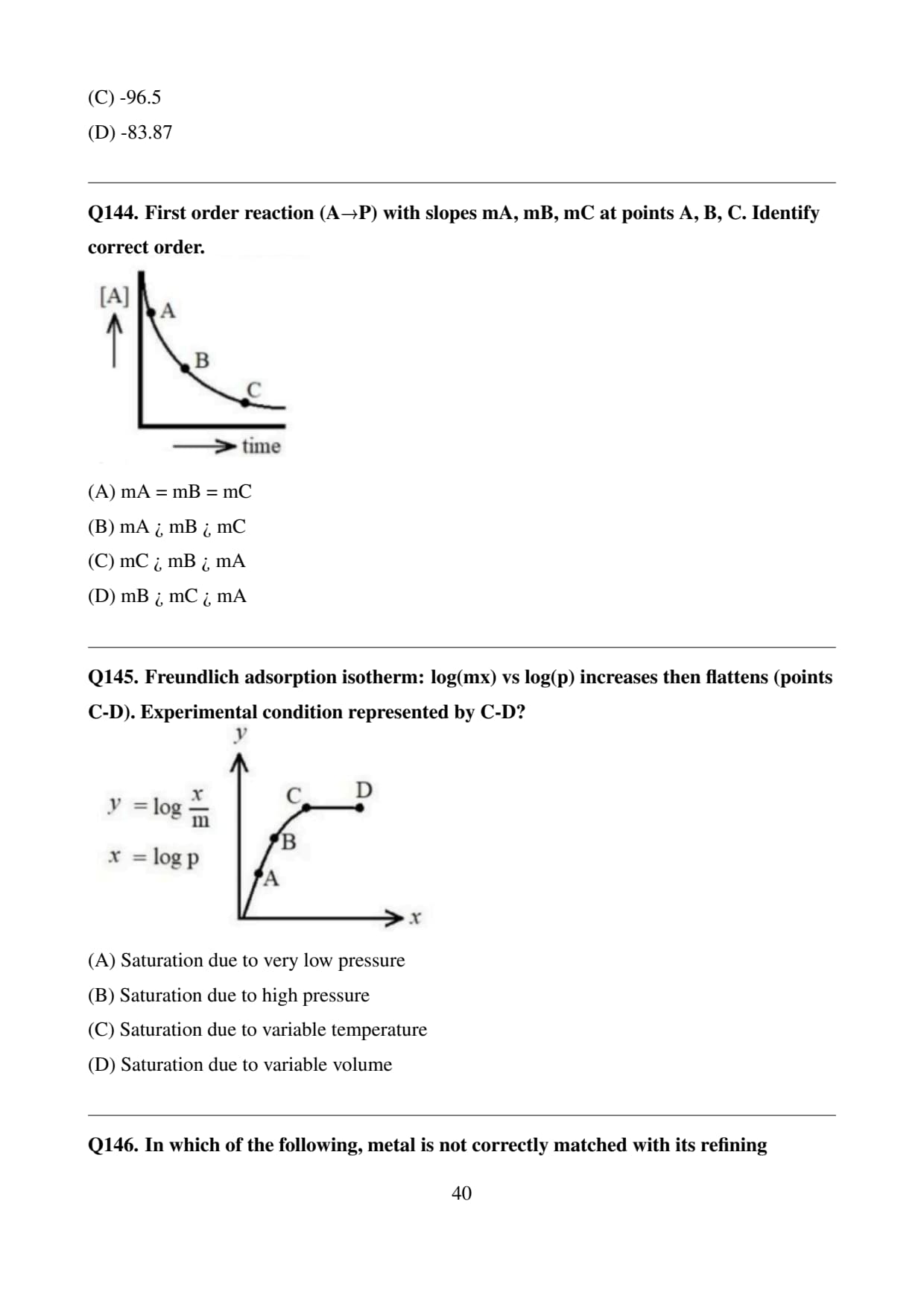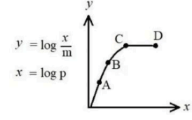 Freundlich adsorption isotherm: log(mx) vs log(p) increases then flattens (points C-D). Experimental condition represented by C-D?