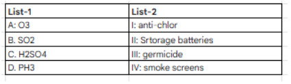 O\(_3\) acts as a germicide (A-III). SO\(_2\) is used in storage batteries (B-II). H\(_2\)SO\(_4\) is anti-chlor (C-I), and PH\(_3\) is applied in smoke screens (D-IV).