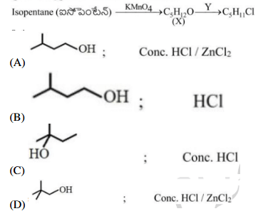 Isopentane (\ce{C5H12) undergoes oxidation with \ce{KMnO4 to form a diol, X, which is \ce{HO-CH2-CH(CH3)-CH2OH (a 1,3-diol). This diol reacts to form an intermediate \ce{C5H12O, and Y is formed with Conc. HCl, leading to \ce{C5H11Cl through chlorination.