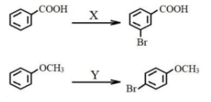 Electrophilic aromatic substitution on benzoic acid gives meta-bromination with Br\(_2\)/Fe. Side-chain bromination occurs under radical conditions (hv).