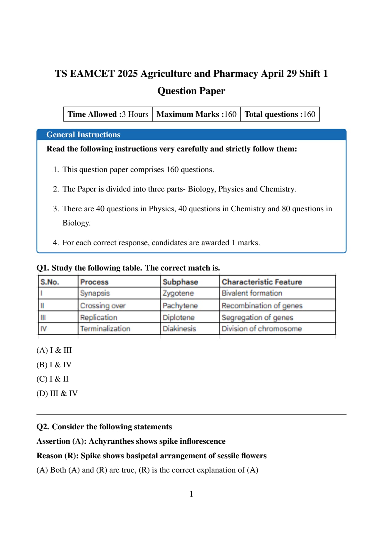 TS EAMCET 2025 Agriculture and Pharmacy April 29 Shift 1 Question Paper with Solution PDF