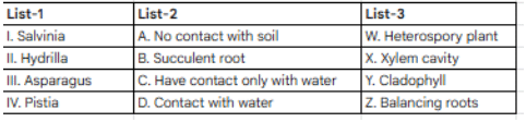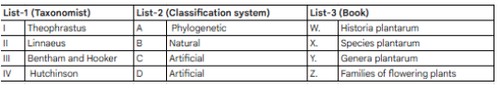 Thus, the correct matching becomes \(I\!-\!D\!-\!W,\ II\!-\!C\!-\!X,\ III\!-\!B\!-\!Y,\ IV\!-\!A\!-\!Z\), which corresponds to option (B).