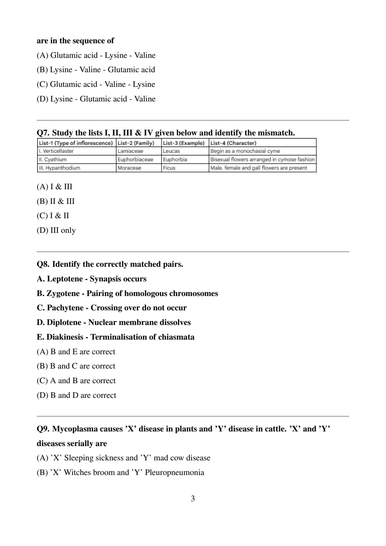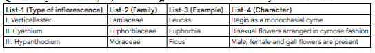 III. Hypanthodium (as in \emph{Ficus, Moraceae) indeed contains male, female and often gall (or sterile) flowers in the enclosed inflorescence — this is correct.