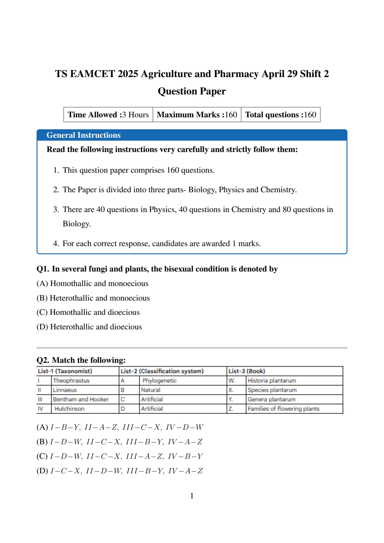 TS EAMCET 2025 Agriculture and Pharmacy April 29 Shift 2 Question Paper with Solution PDF