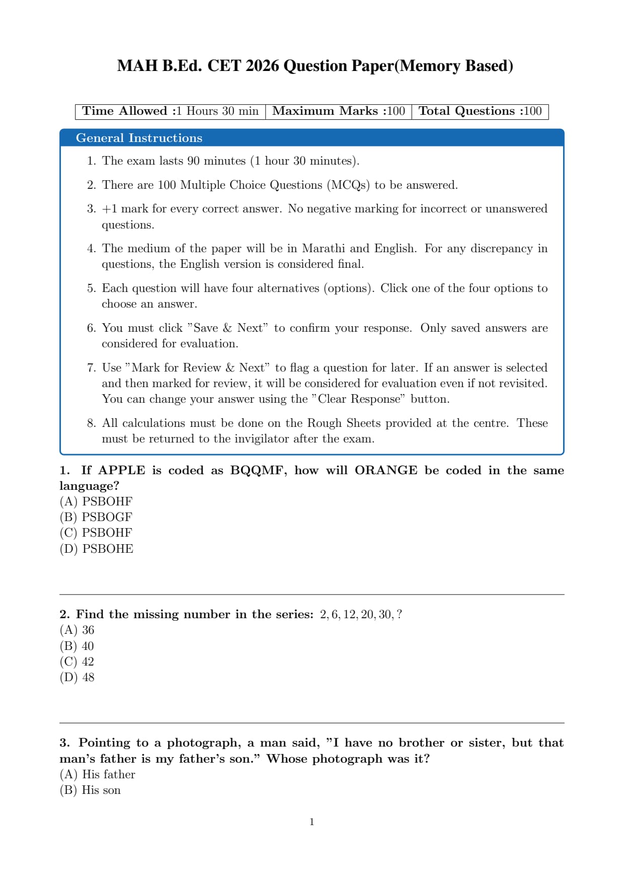 MAH B.Ed CET 2026 Question Paper with Solution PDF – Memory Based