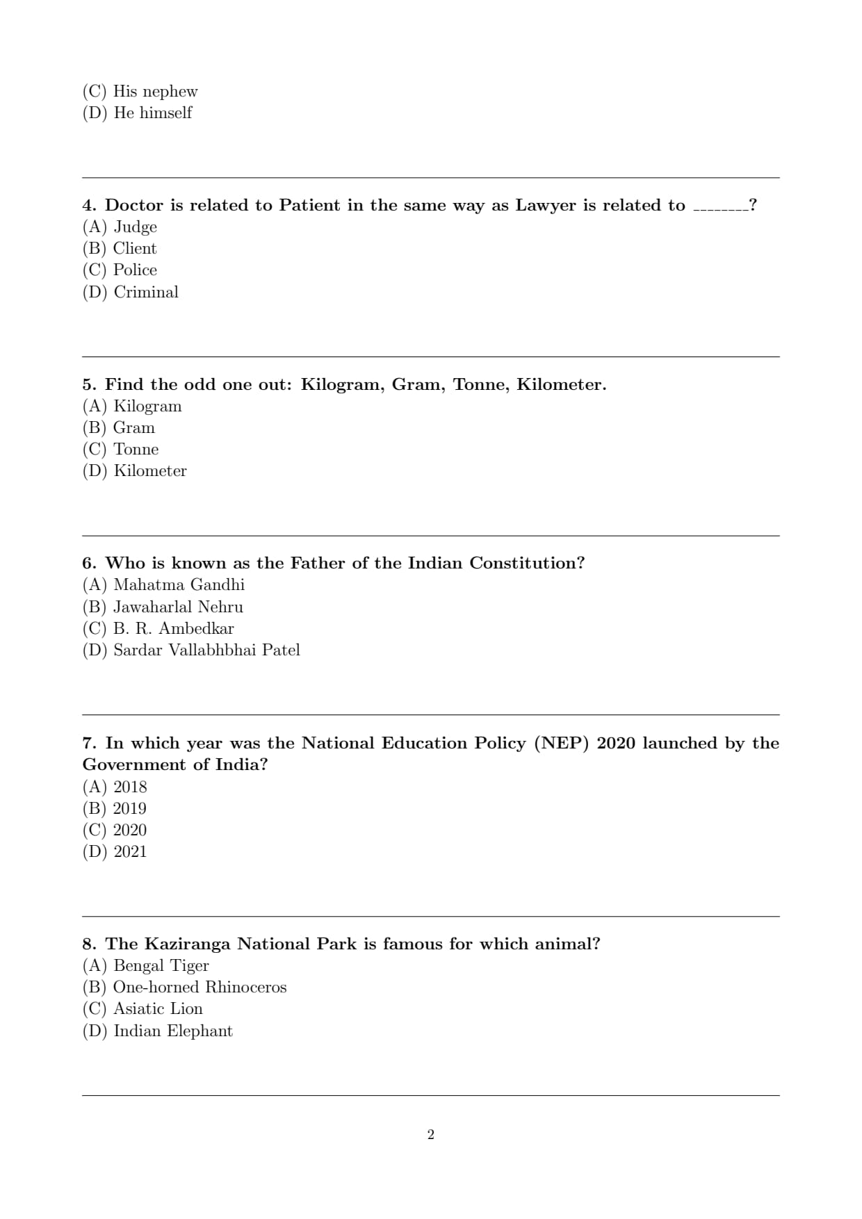 \[ Doctor : Patient :: Lawyer : Client \] Quick Tip: In analogy questions, first identify the type of relationship (profession, function, cause-effect, part-whole, etc.). Then look for the option that follows the same relationship.