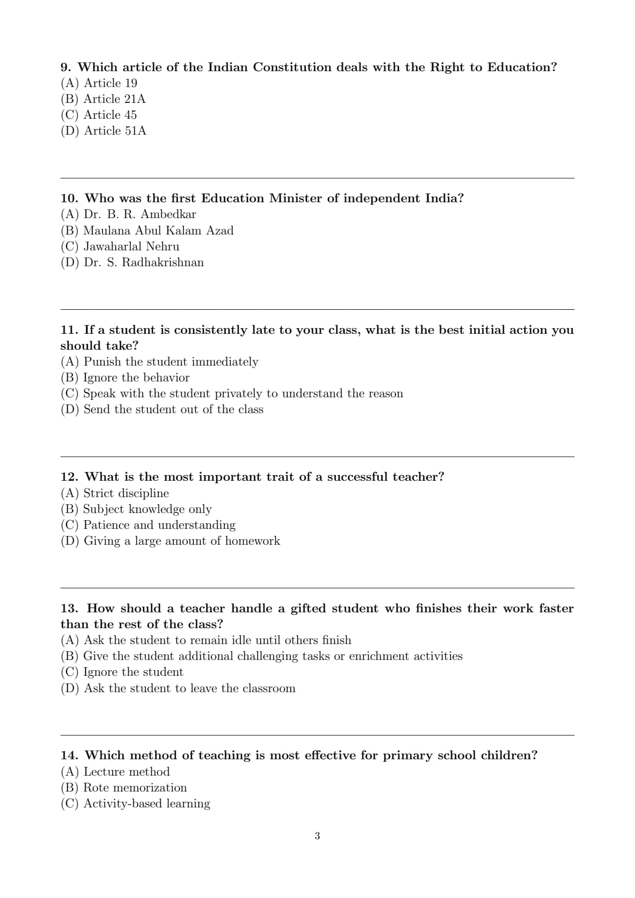 | Teaching Aptitude | Easy to Moderate | Most questions were situation-based and could be solved with basic logic and a positive teaching mindset. |
