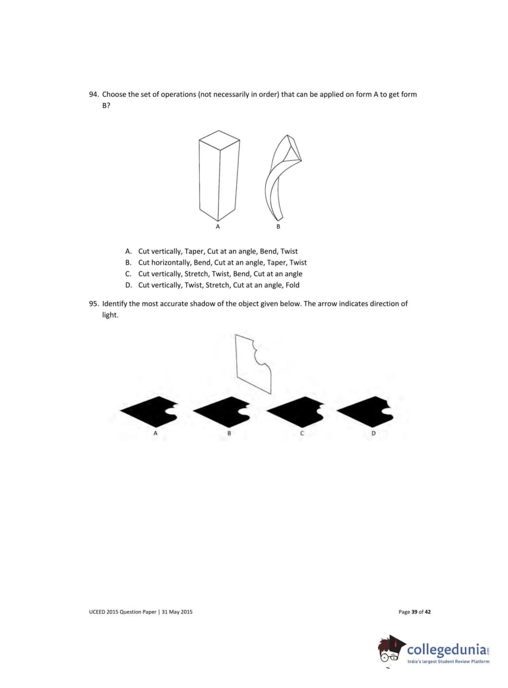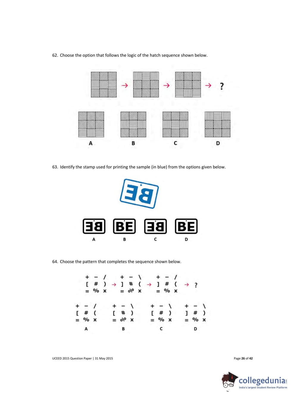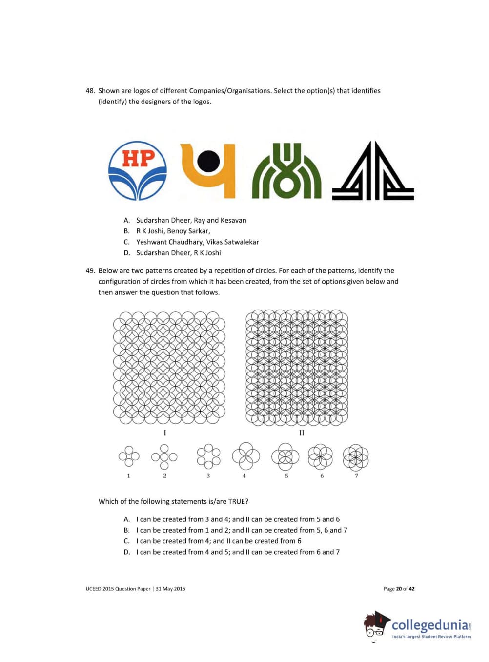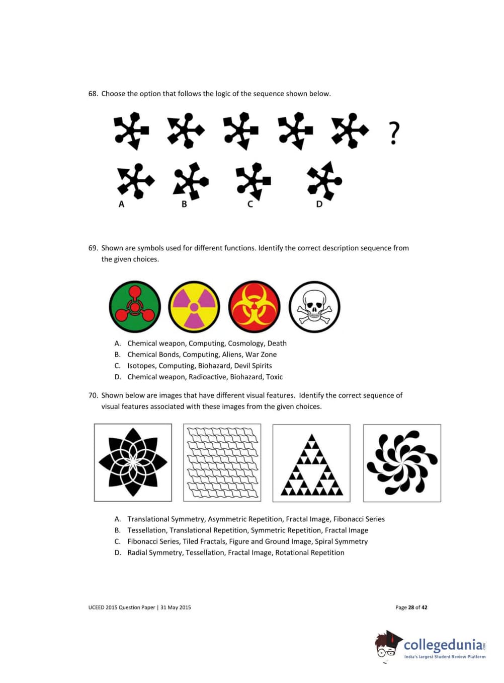 UCEED 2015 Question paper with answer key pdf conducted on May 31 is available for download. The exam was successfully organized by IIT Bombay. The question paper comprised a total of 100 questions divided among 3 sections.