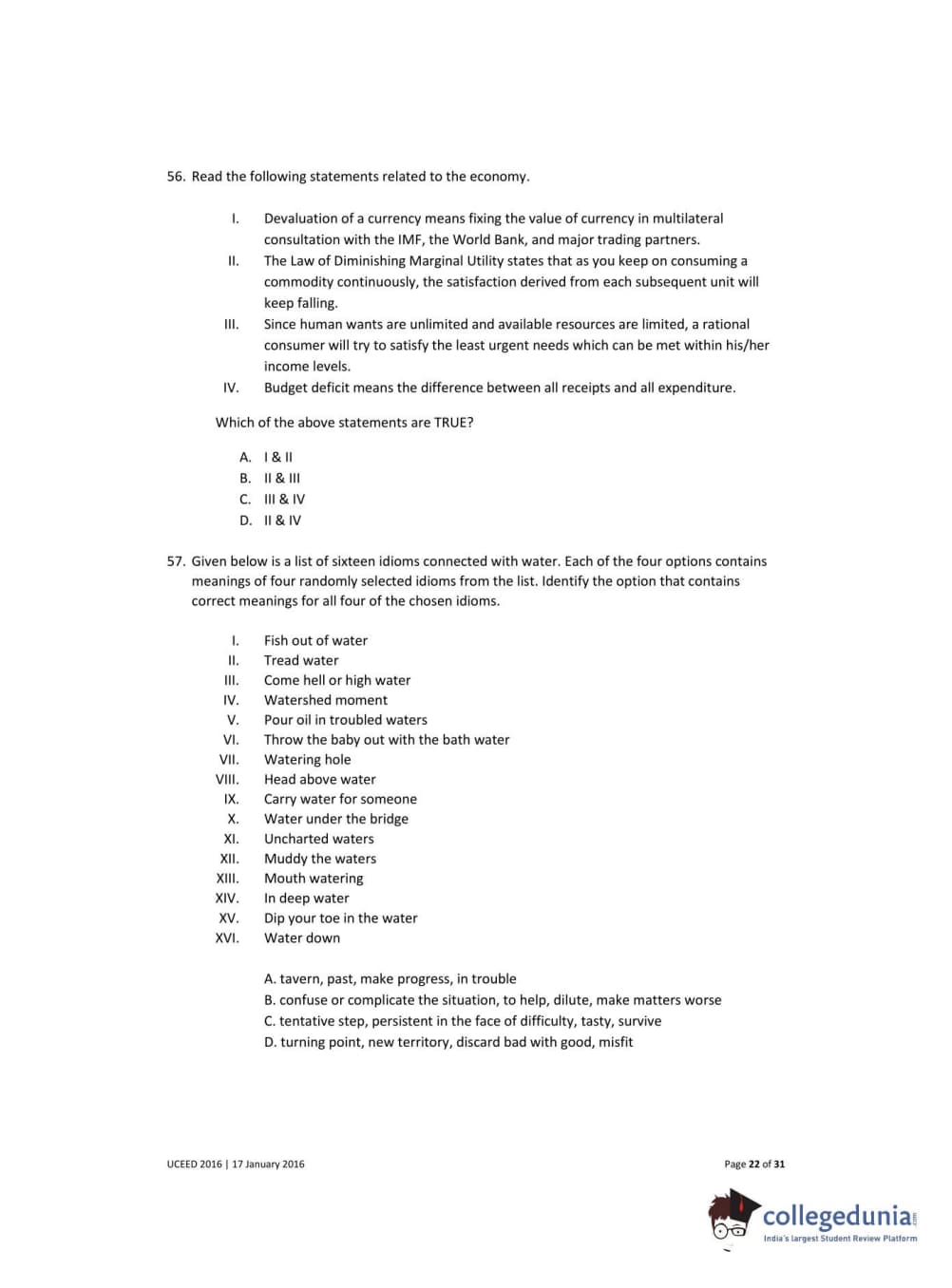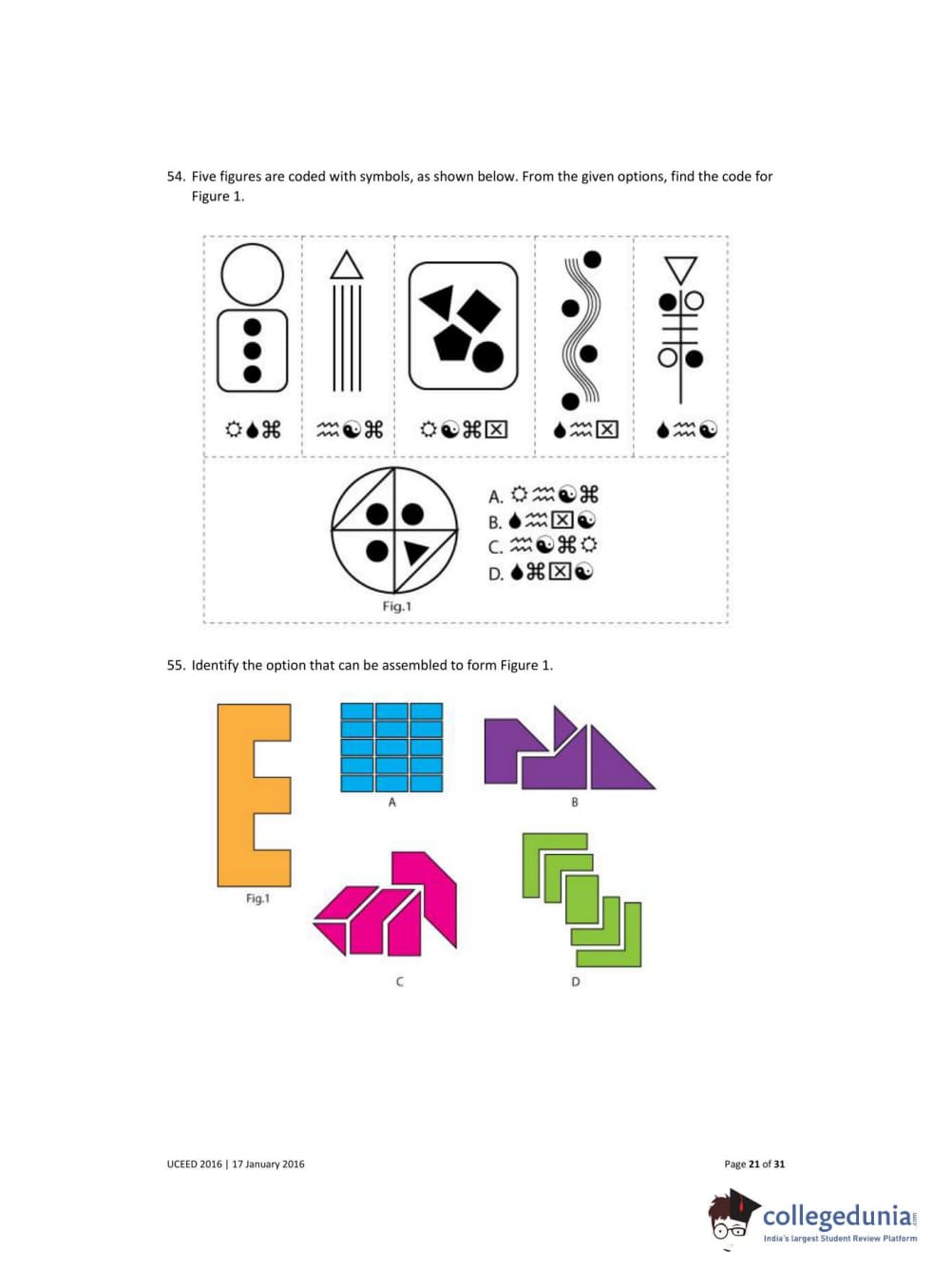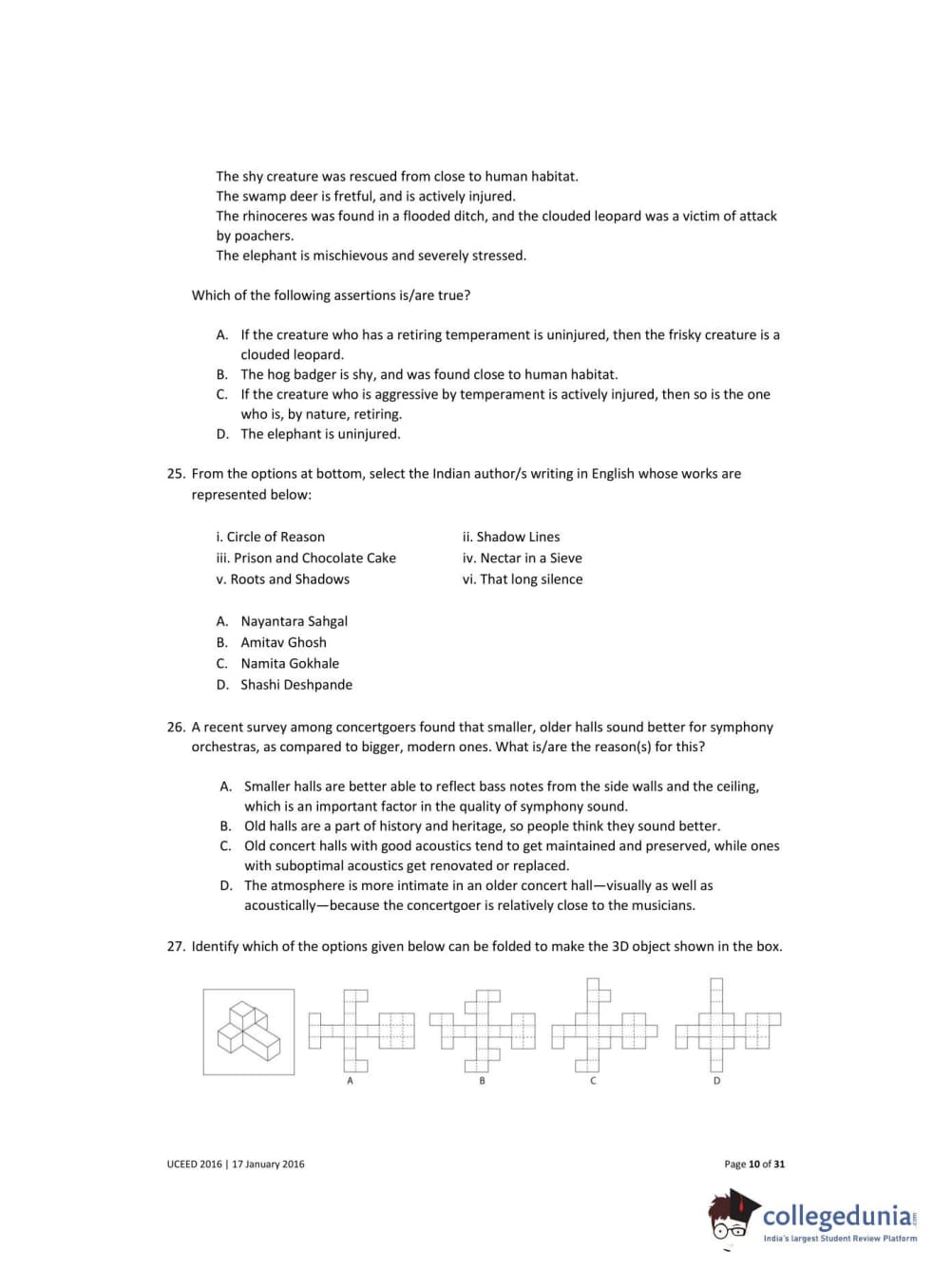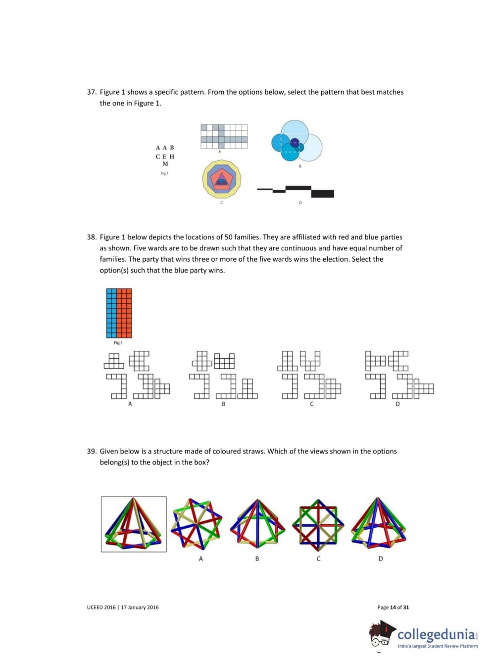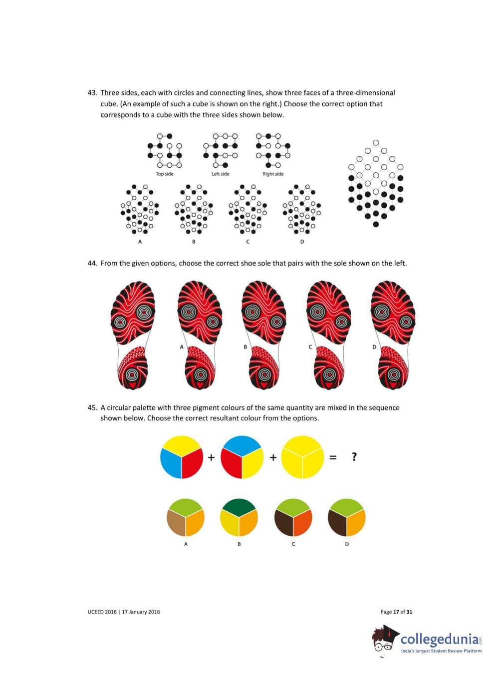 UCEED 2016 Question paper with answer key pdf conducted on January 17 is available for download. The exam was successfully organized by IIT Bombay. In terms of difficulty level, UCEED was of Easy to Moderate level. The question paper comprised a total of 80 questions divided among 3 sections.