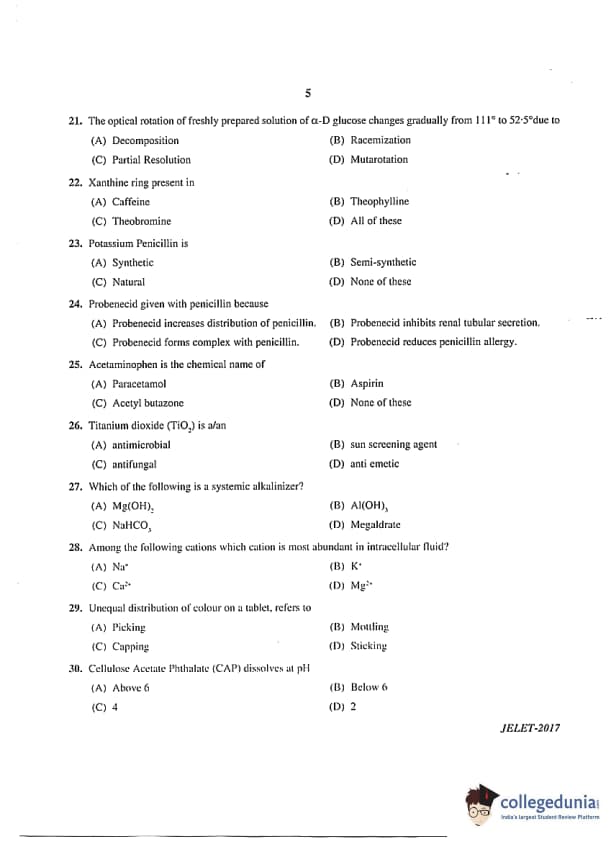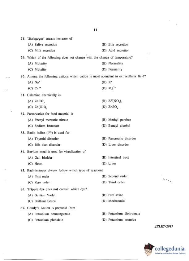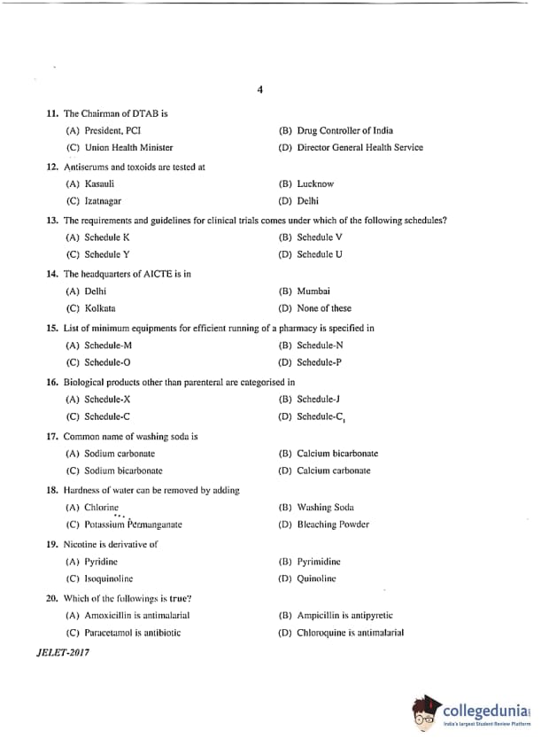 JELET 2017 Pharmacy Question Paper with Answer Key PDFs