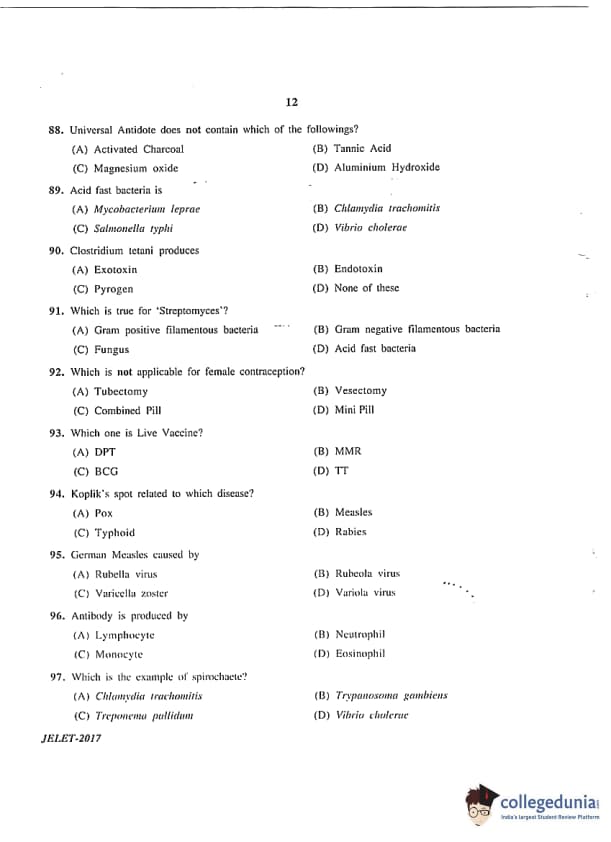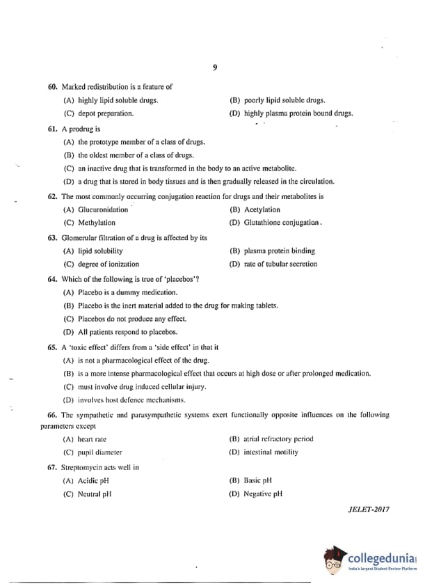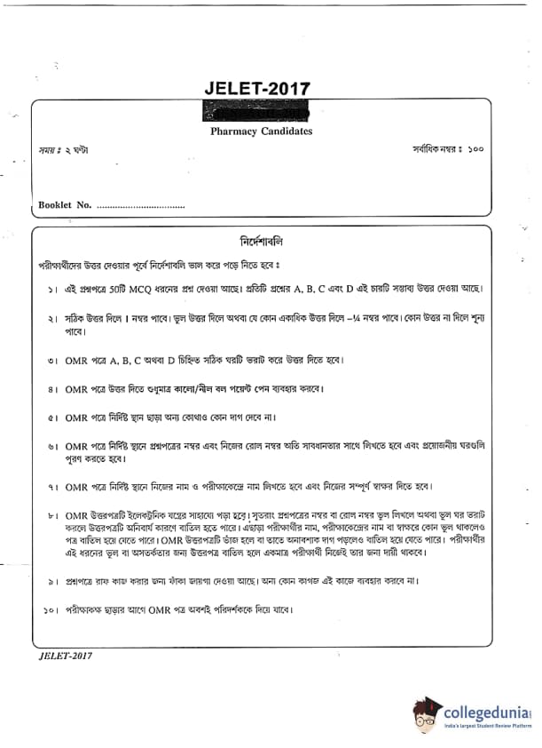 JELET 2017 Pharmacy Question paper with answer key pdf conducted on June 11, 2017 is available for download. The exam was successfully organized by WBJEEB. The question paper comprised a total of 100 questions.