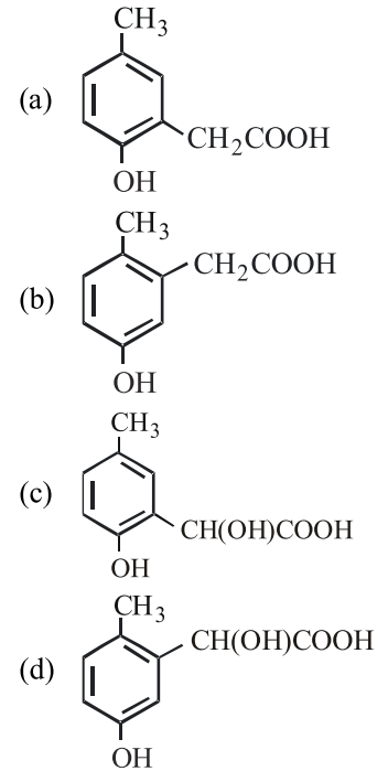 \( p \)-cresol reacts with chloroform in alkaline medium to give the compound A which adds hydrogen cyanide to form the compound B. The latter on acidic hydrolysis gives chiral carboxylic acid. The structure of the carboxylic acid is: