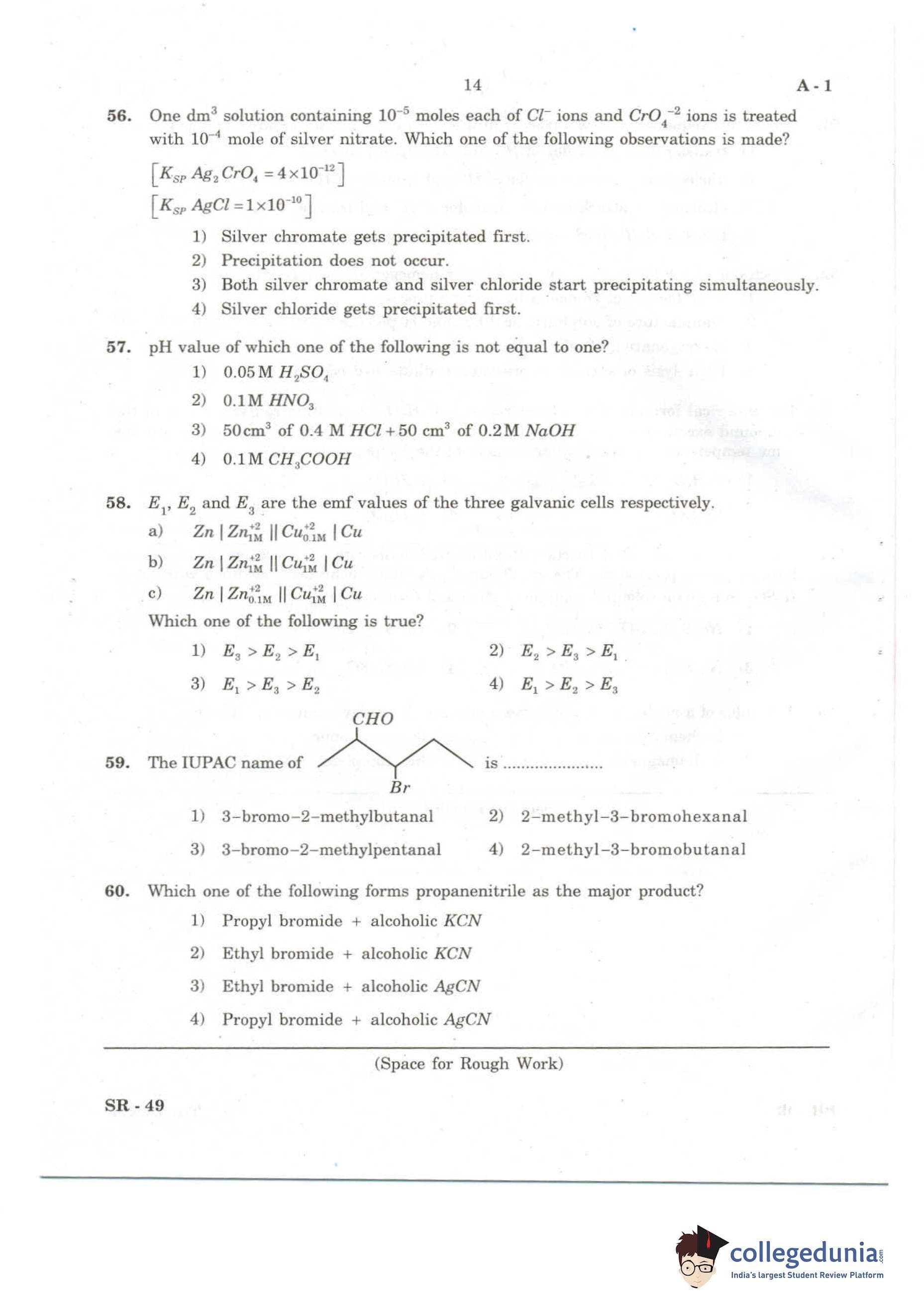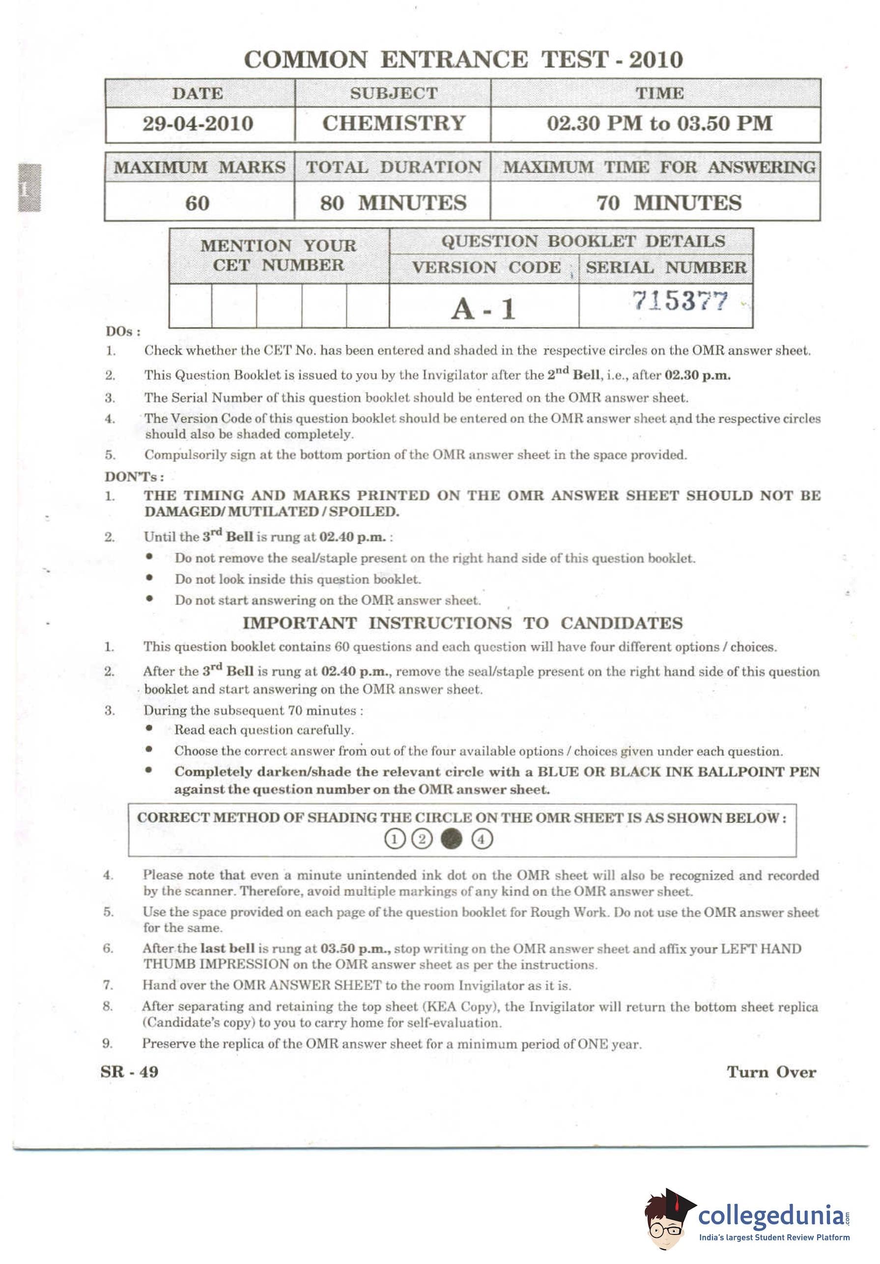 KCET 2010 Chemistry Question Paper with Answer Key pdf is available for download. The exam was conducted by Karnataka Examination Authority (KEA) on April 29, 2010 in the Afternoon Session 2:30 PM to 3:50 PM. The question paper comprised a total of 60 questions.