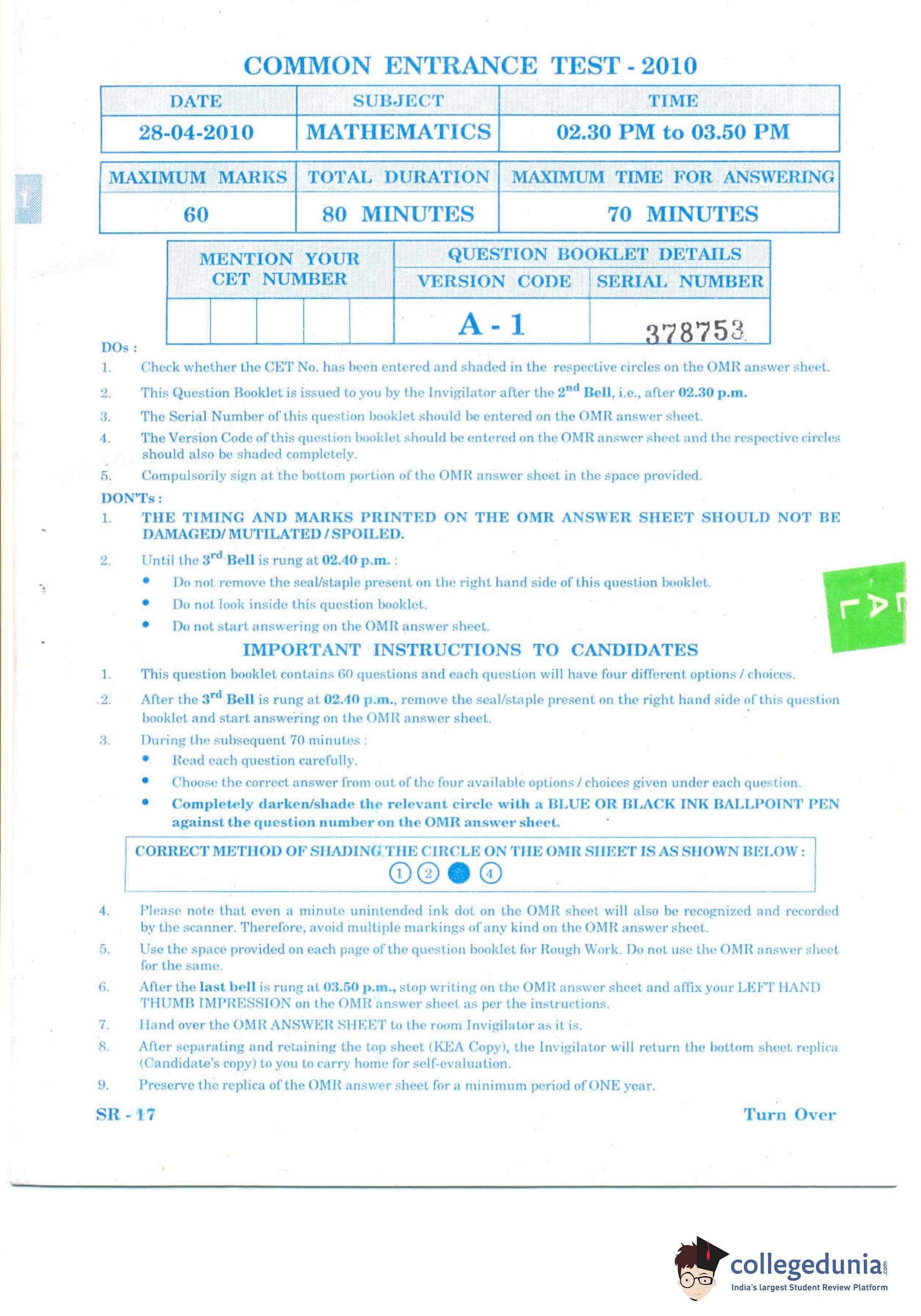 KCET 2010 Mathematics Question Paper with Answer Key pdf is available for download. The exam was conducted by Karnataka Examination Authority (KEA) on April 28, 2010 in the Afternoon Session 2:30 PM to 3:50 PM. The question paper comprised a total of 60 questions.