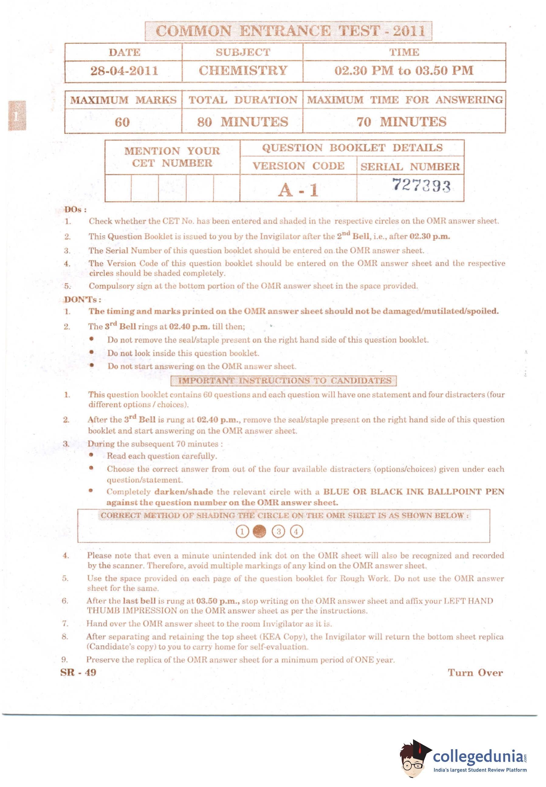 KCET 2011 Chemistry Question Paper with Answer Key pdf is available for download. The exam was conducted by Karnataka Examination Authority (KEA) on April 28, 2011 in the Afternoon Session 2:30 PM to 3:50 PM. The question paper comprised a total of 60 questions.
