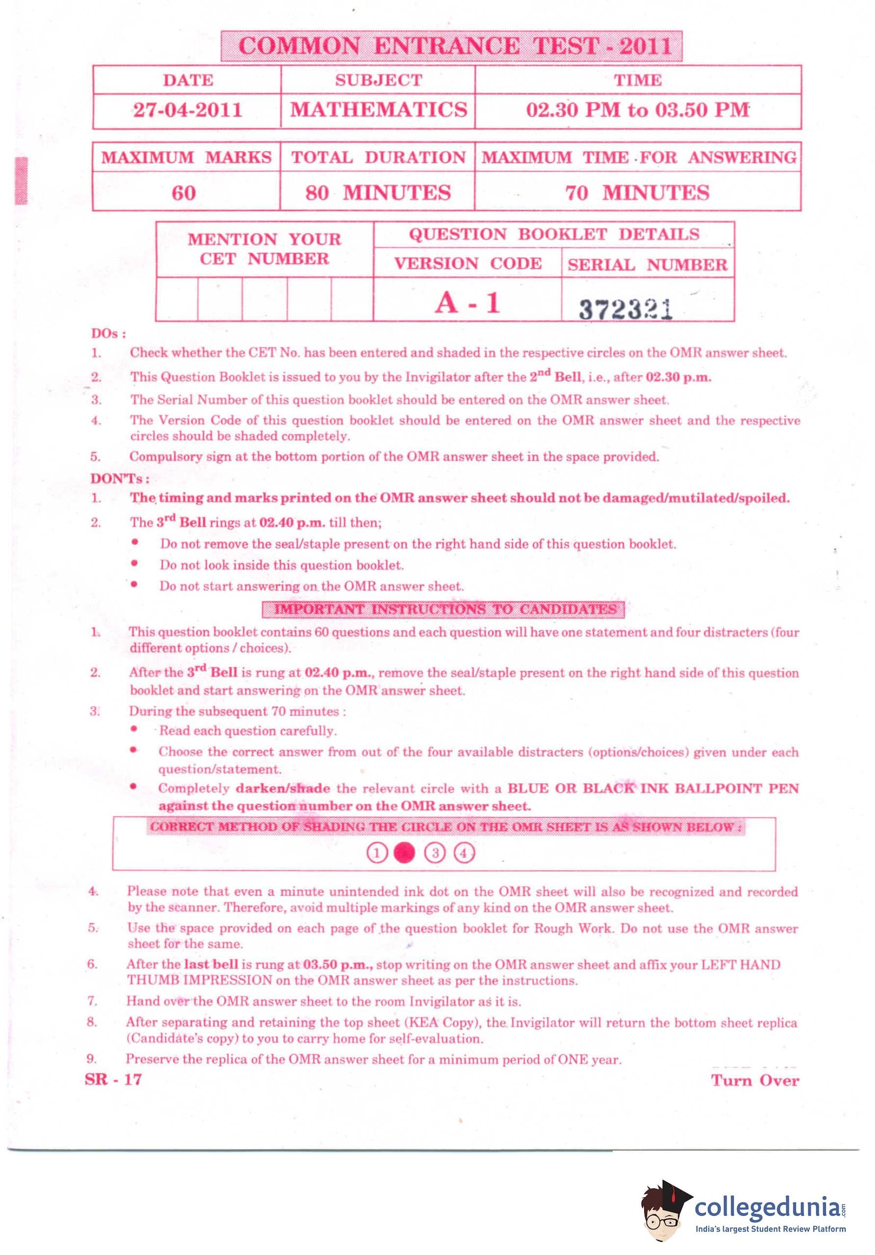 KCET 2011 Mathematics Question Paper with Answer Key pdf is available for download. The exam was conducted by Karnataka Examination Authority (KEA) on April 27, 2011 in the Afternoon Session 2:30 PM to 3:50 PM. The question paper comprised a total of 60 questions.
