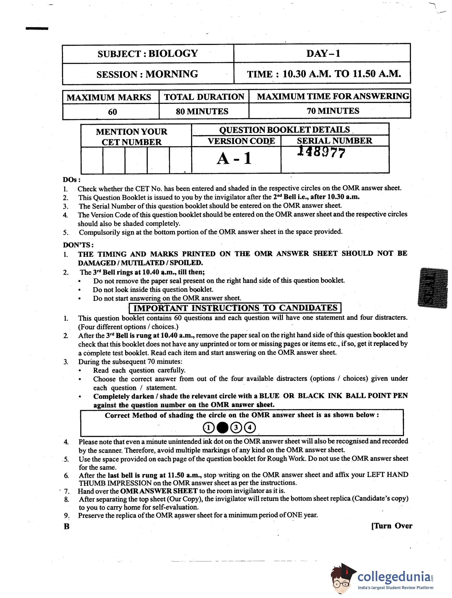 KCET 2013 Biology Question Paper with Answer Key pdf is available for download. The exam was conducted by Karnataka Examination Authority (KEA) on May 1, 2013 in the Morning Session 10:30 AM to 11:50 AM. The question paper comprised a total of 60 questions.