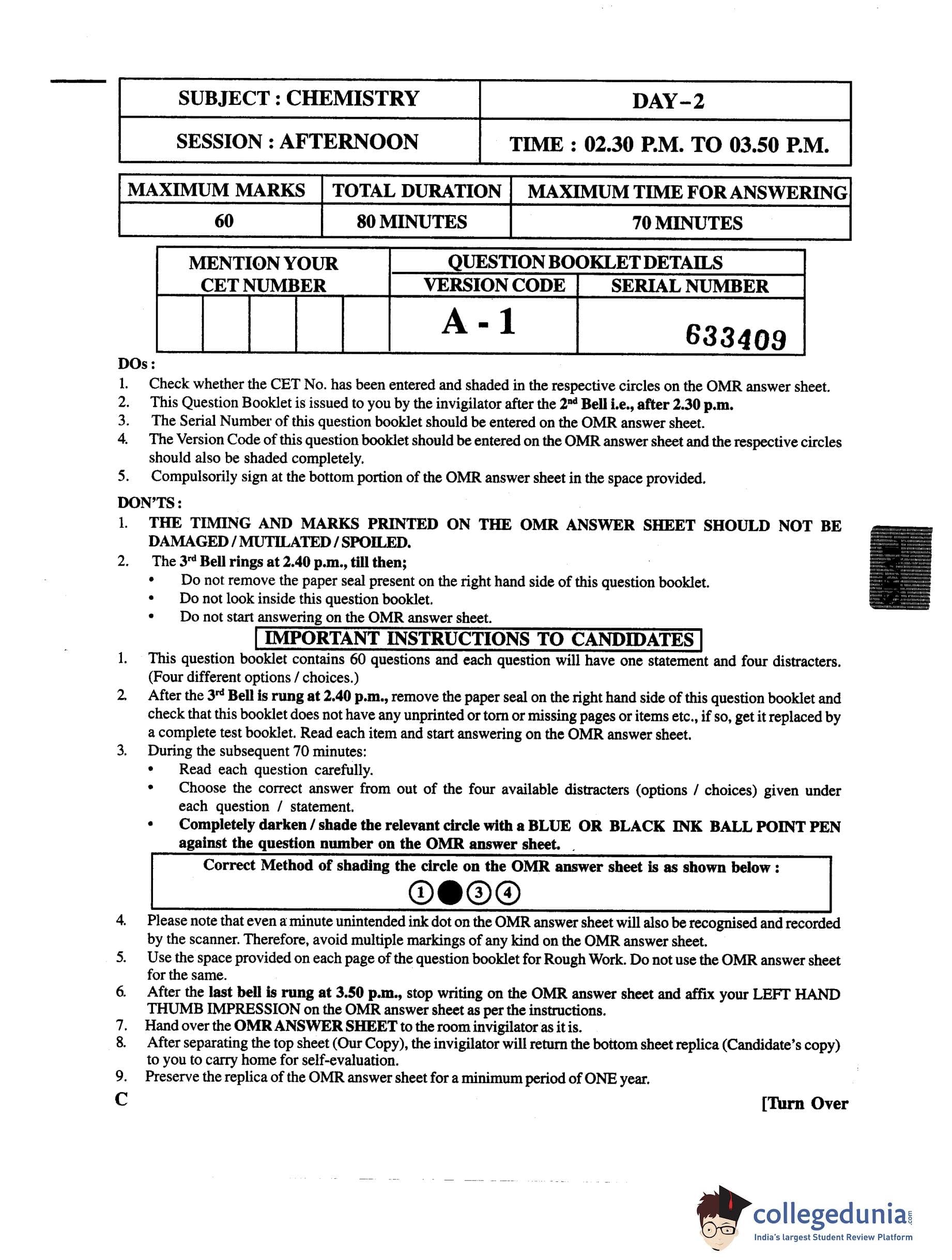 KCET 2013 Chemistry Question Paper with Answer Key pdf is available for download. The exam was conducted by Karnataka Examination Authority (KEA) on May 2, 2013 in the Afternoon Session 2:30 PM to 3:50 PM. The question paper comprised a total of 60 questions.