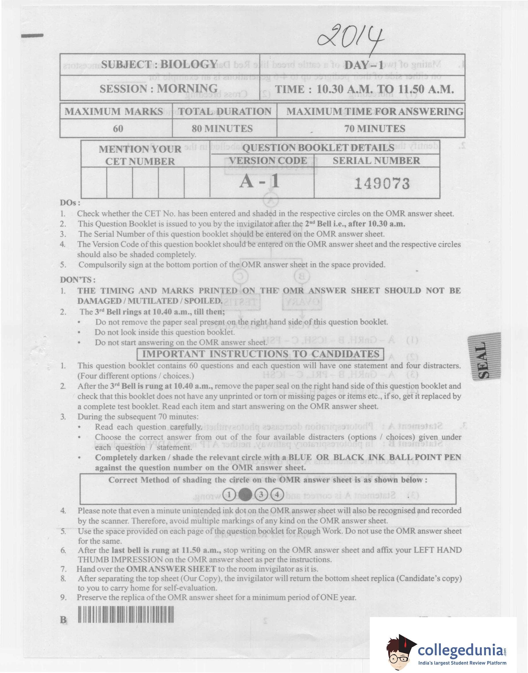 KCET 2014 Biology Question Paper with Answer Key pdf is available for download. The exam was conducted by Karnataka Examination Authority (KEA) on May 1, 2014 in the Morning Session 10:30 AM to 11:50 AM. The question paper comprised a total of 60 questions.