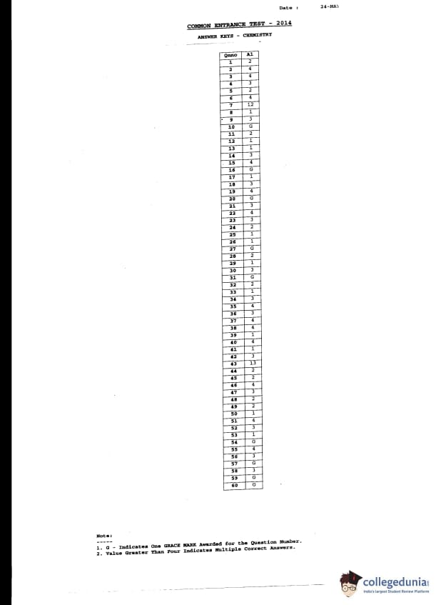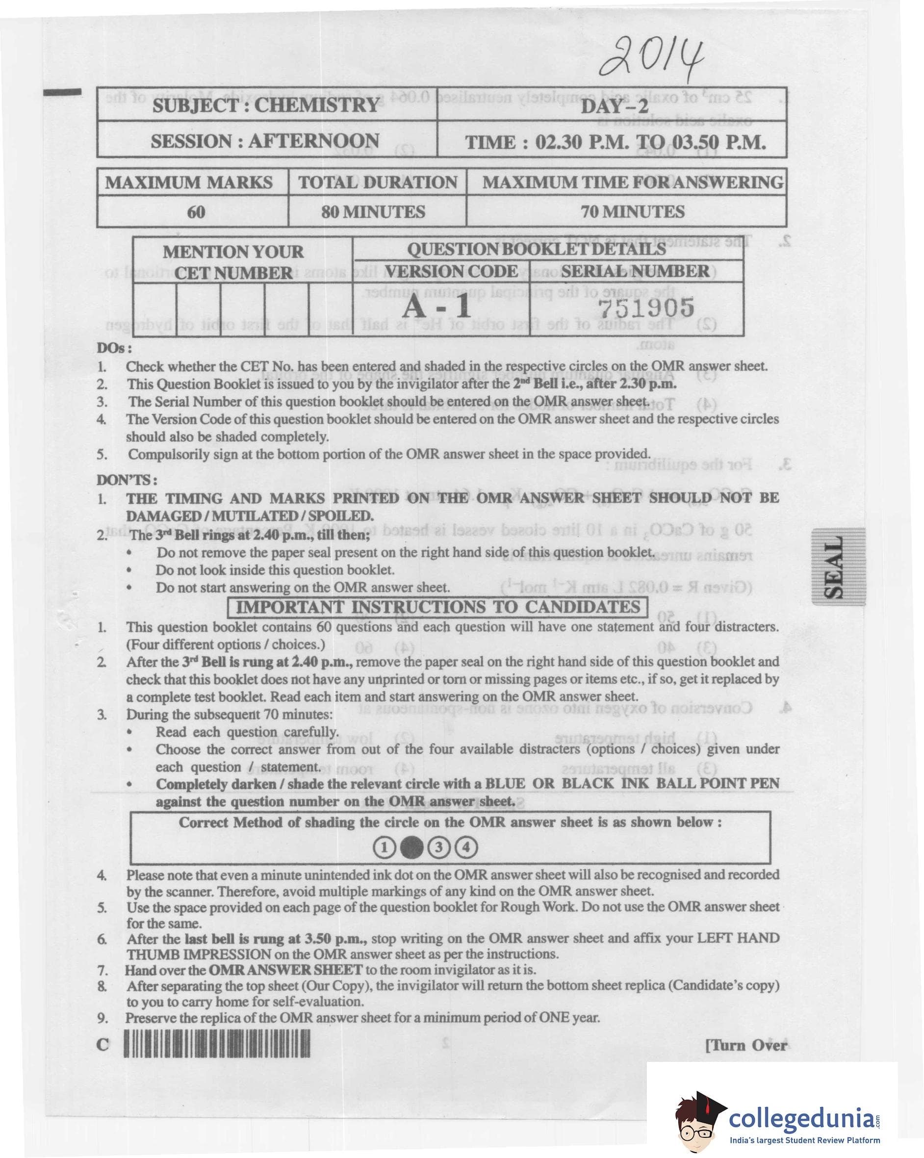 KCET 2014 Chemistry Question Paper with Answer Key pdf is available for download. The exam was conducted by Karnataka Examination Authority (KEA) on May 2, 2014 in the Afternoon Session 2:30 PM to 3:50 PM. The question paper comprised a total of 60 questions.