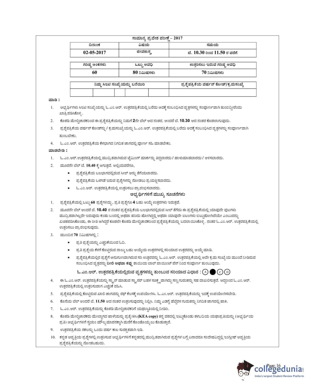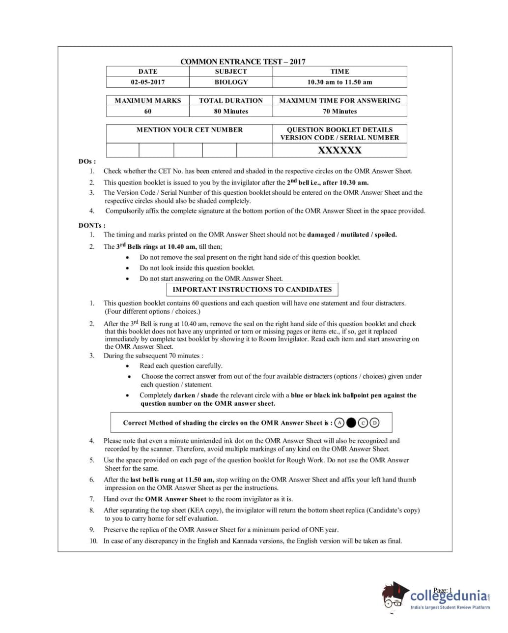 KCET 2017 Biology Question paper with answer key pdf conducted on May 2, 2017 in Morning Session 10:30 AM to 11:50 AM is available for download. The exam was successfully organized by Karnataka Examinations Authority (KEA). The question paper comprised a total of 60 questions.