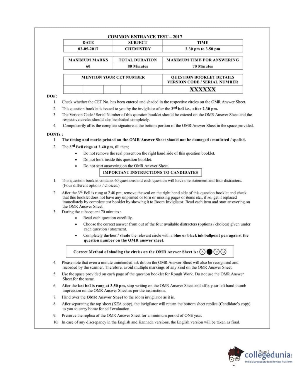 KCET 2017 Chemistry Question paper with answer key pdf conducted on May 3, 2017 in Afternoon Session 2:30 PM to 3:50 PM is available for download. The exam was successfully organized by Karnataka Examinations Authority (KEA). In terms of difficulty level, KCET was of Moderate level. The question paper comprised a total of 60 questions.
