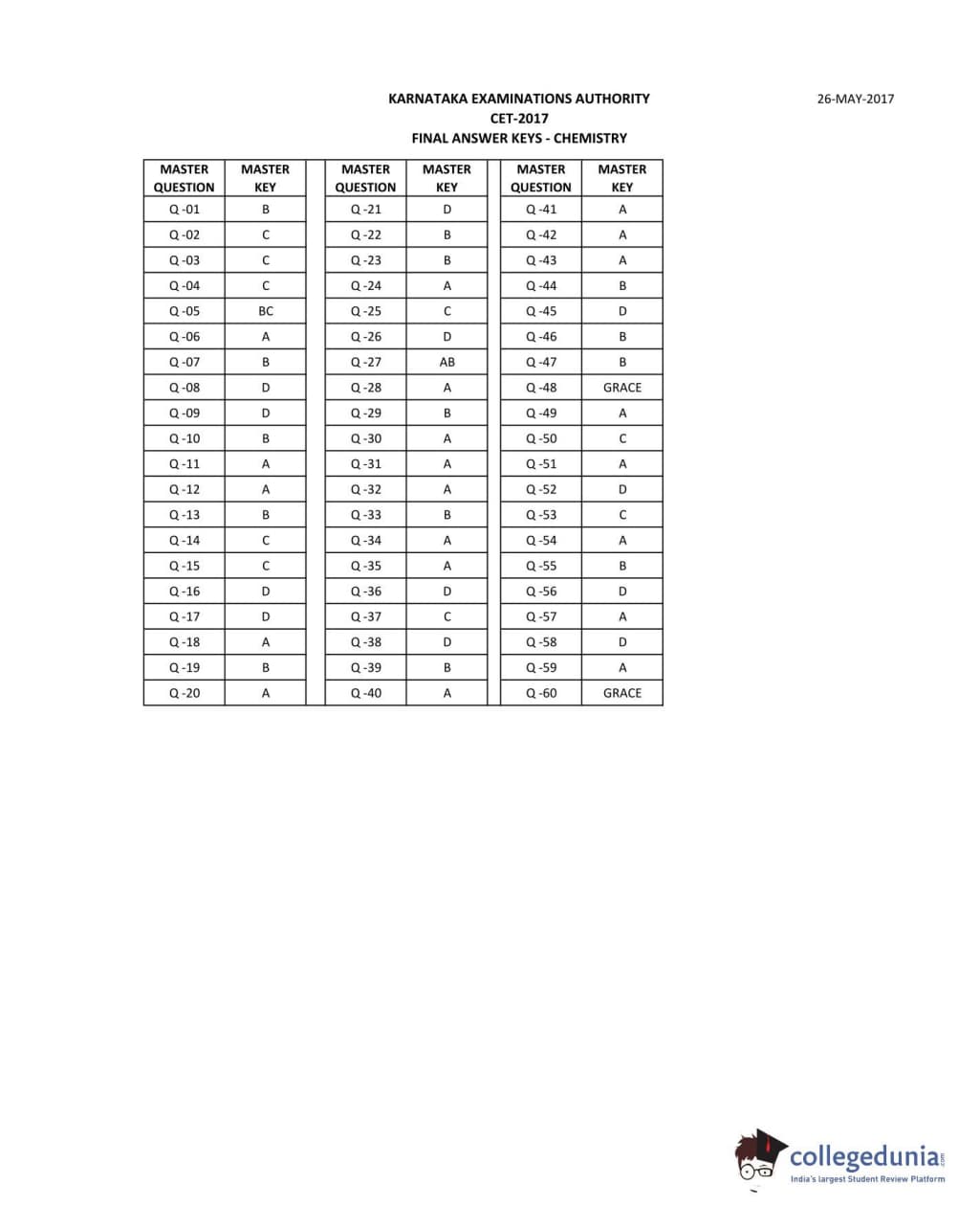 | KCET 2017 Chemistry Question Paper PDF | KCET 2017 Chemistry Answer Key PDF |