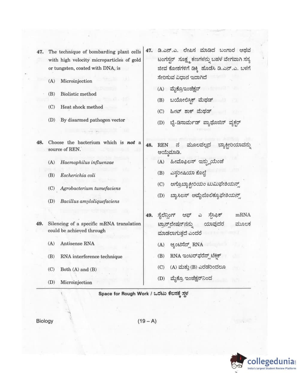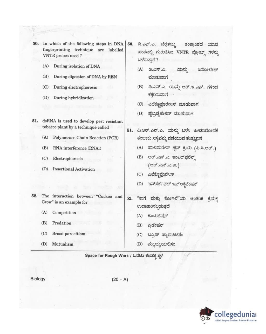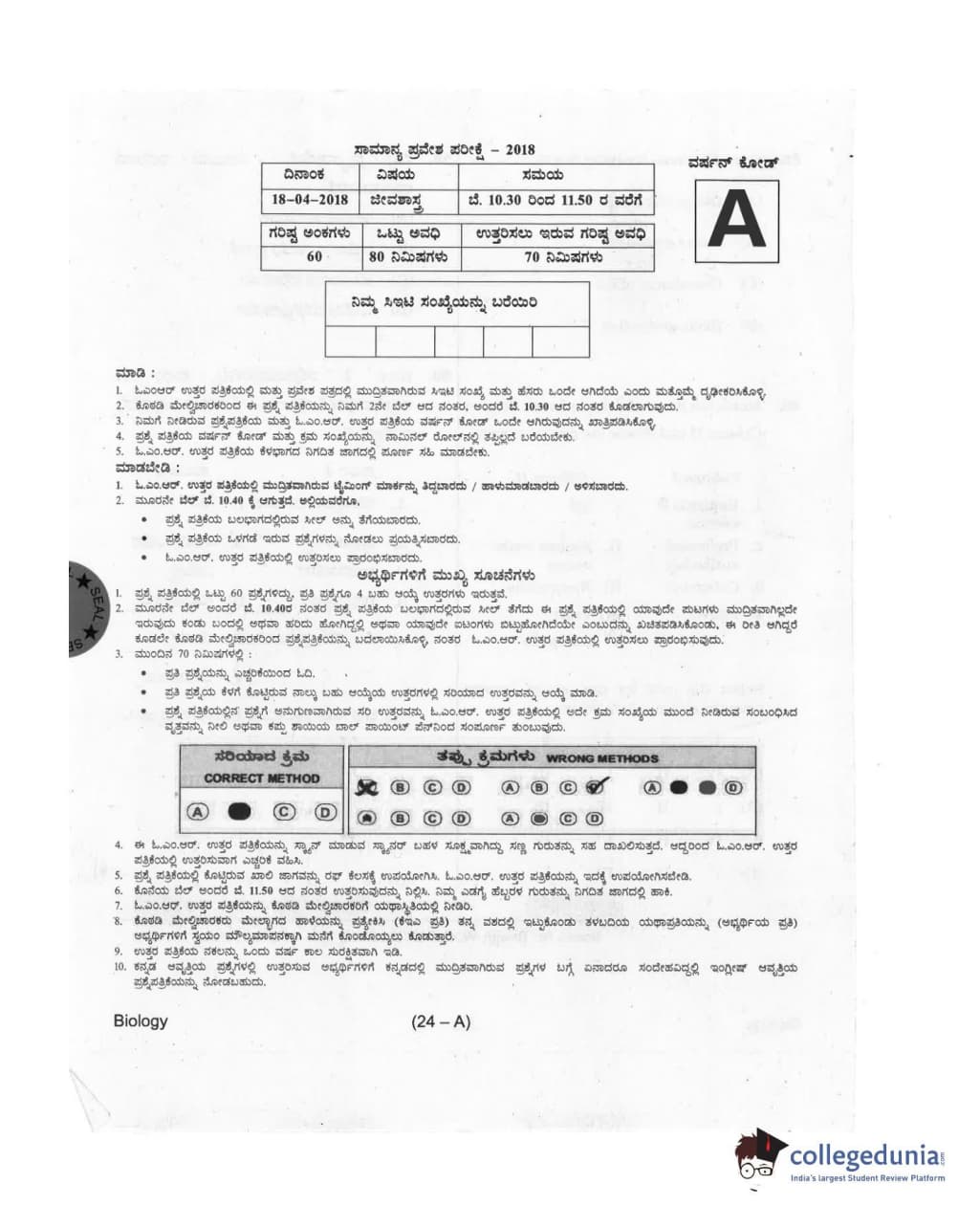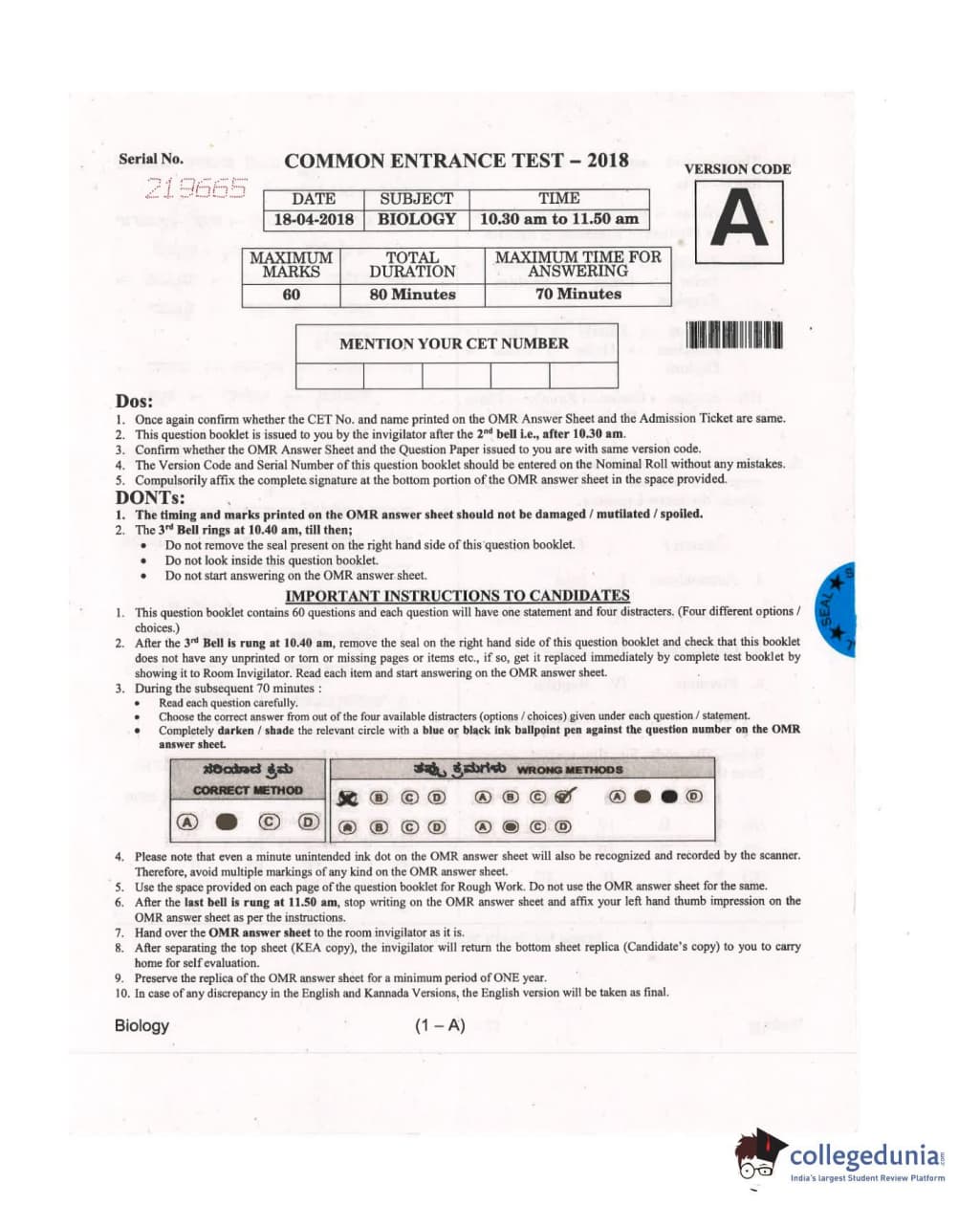KCET 2018 Biology Question paper with answer key pdf conducted on April 18, 2018 in Morning Session 10:30 AM to 11:50 AM for A is available for download. The exam was successfully organized by Karnataka Examinations Authority (KEA). In terms of difficulty level, KCET was of Moderate level. The question paper comprised a total of 60 questions.