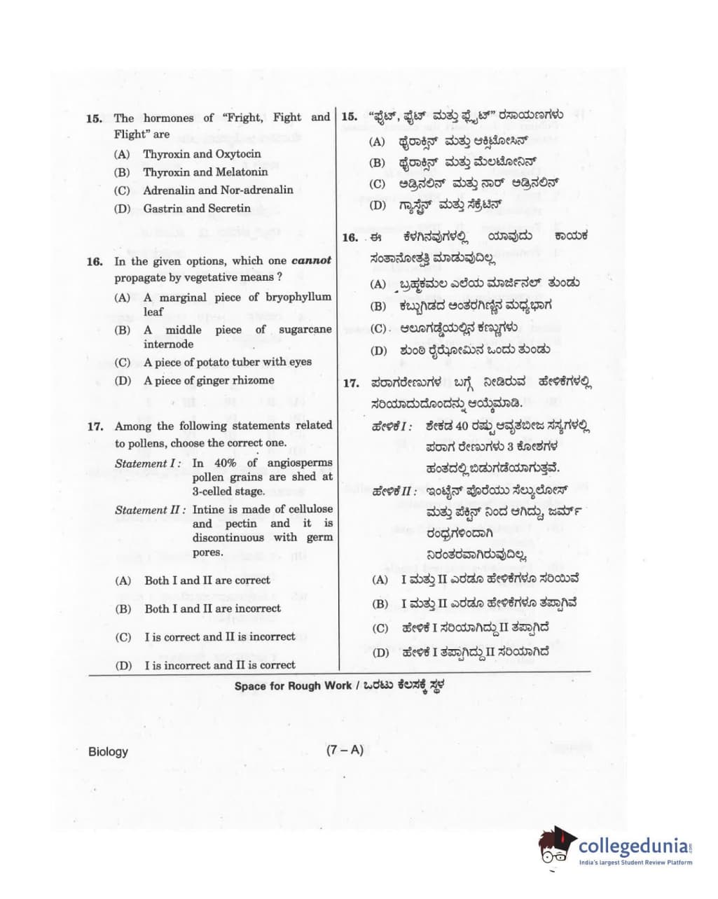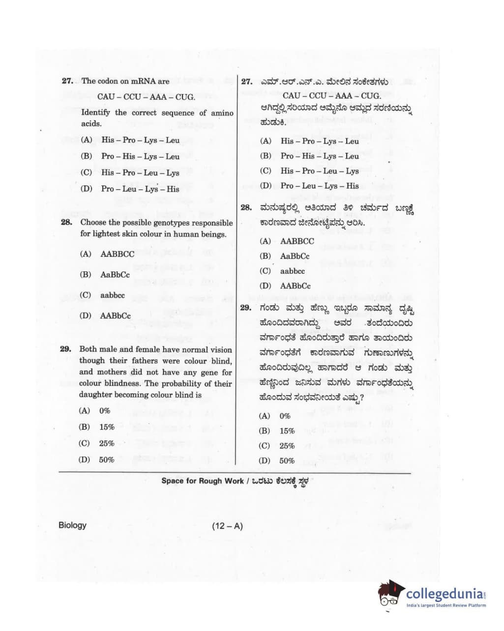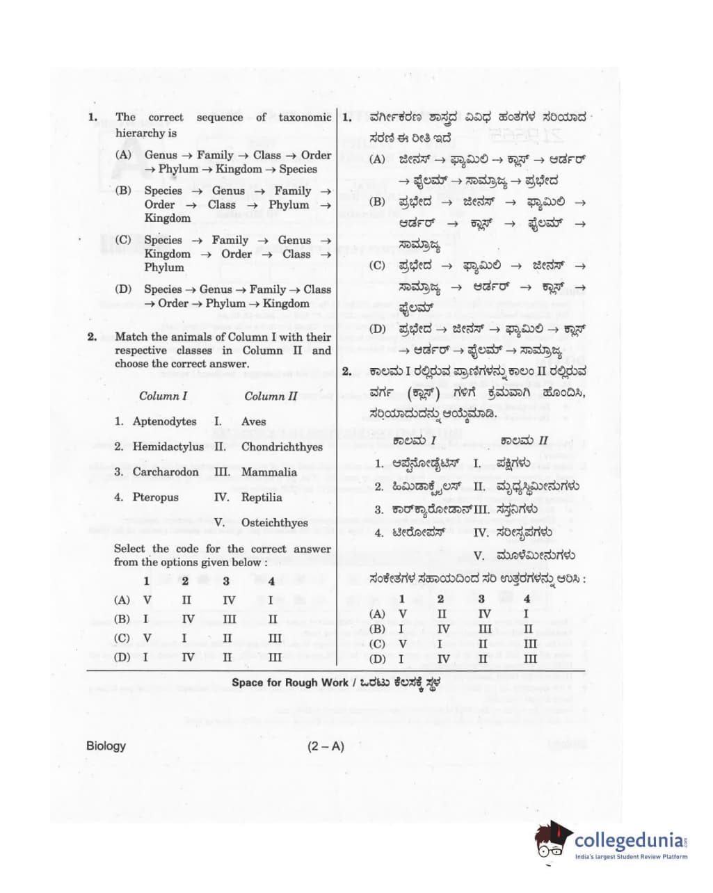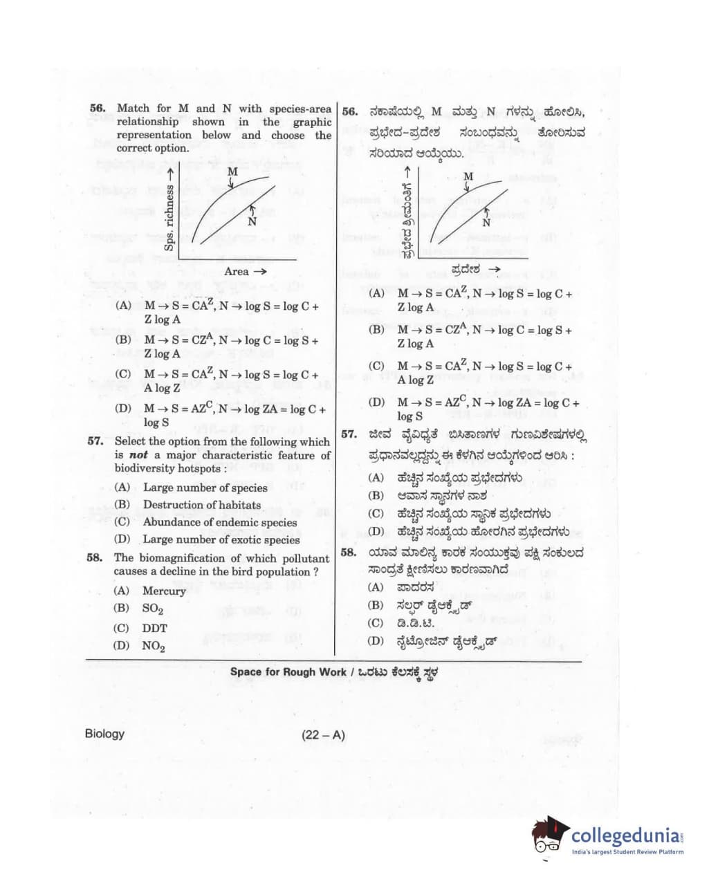 KCET 2018 Biology Question paper with answer key pdf conducted on April 18, 2018 in Morning Session 10:30 AM to 11:50 AM for A is available for download. The exam was successfully organized by Karnataka Examinations Authority (KEA). In terms of difficulty level, KCET was of Moderate level. The question paper comprised a total of 60 questions.