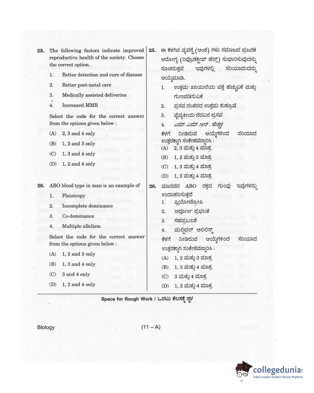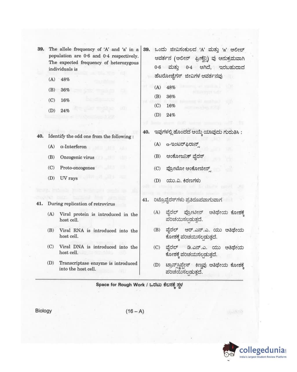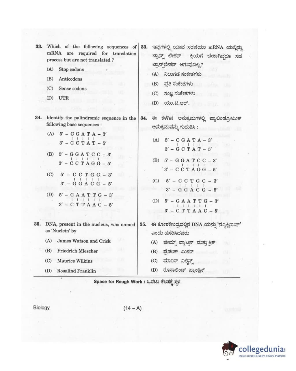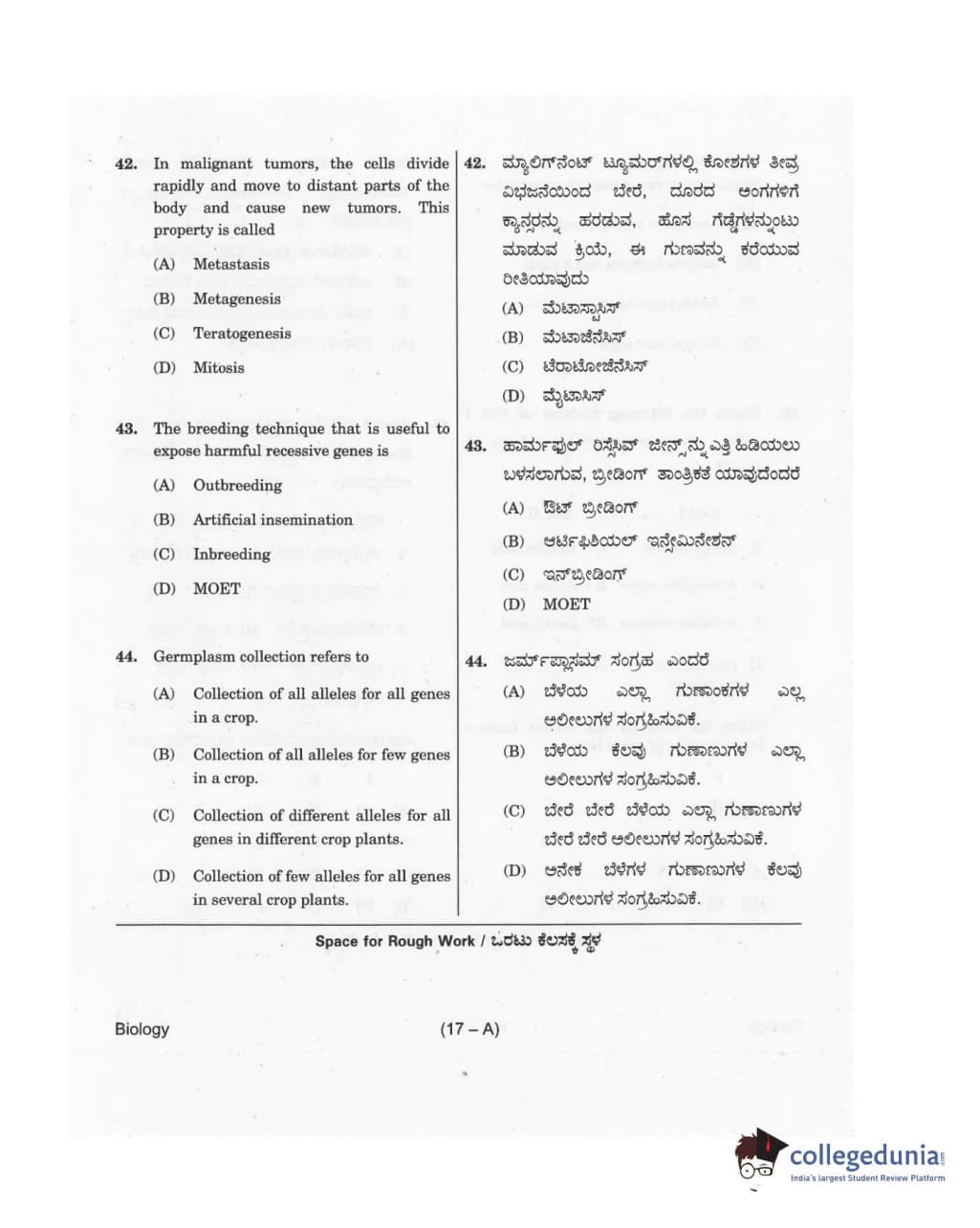 KCET 2018 Biology Question paper with answer key pdf conducted on April 18, 2018 in Morning Session 10:30 AM to 11:50 AM for A is available for download. The exam was successfully organized by Karnataka Examinations Authority (KEA). In terms of difficulty level, KCET was of Moderate level. The question paper comprised a total of 60 questions.